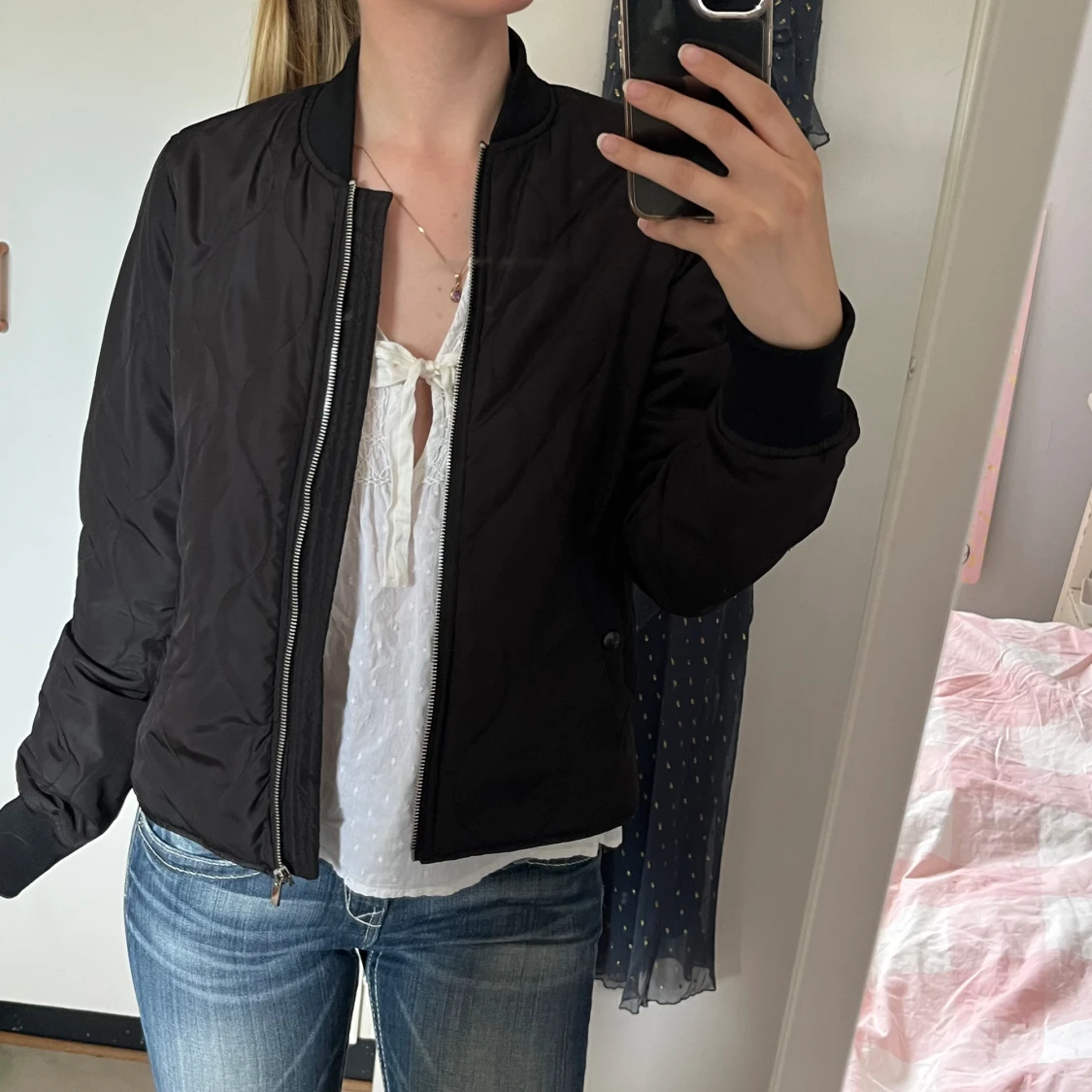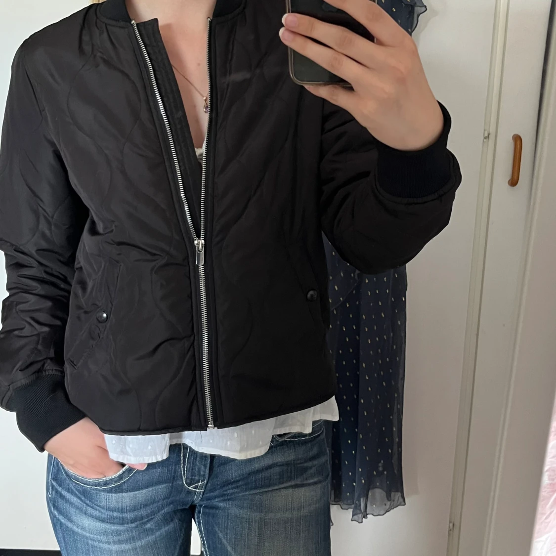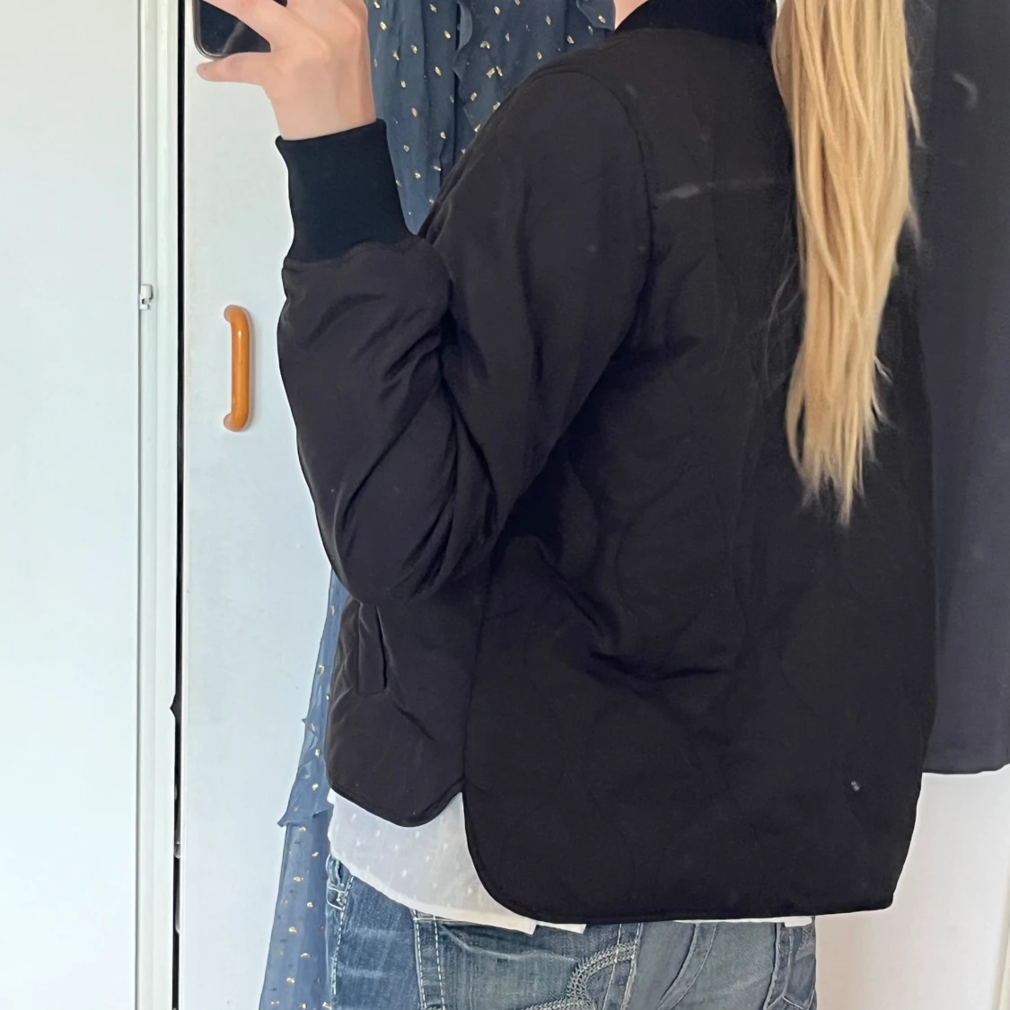 Svart/Mörkbrun quiltad tunn jacka, har ett litet hål under armen (kan sys om det önskas), säljer då den är lite liten för mig! Har en exakt likadan i S också (utan hål) så bara att säga till❤️