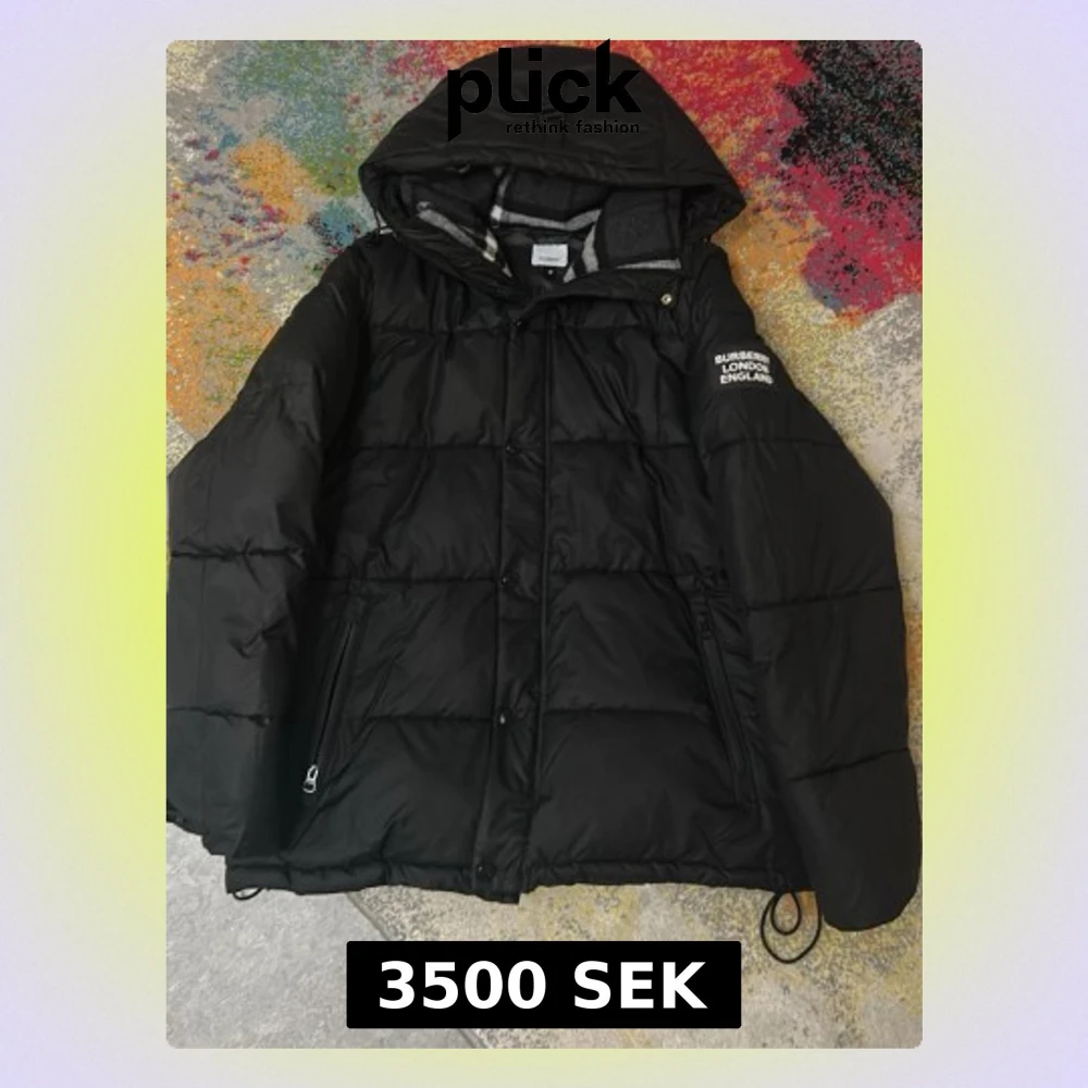 Svart pufferjacka från Burberry med avtagbara ärmar, huva och dragkedjor på fickorna. Insidan har ett grått och vitt rutigt foder. Jackan har snörning nedtill och tryckknappar framtill. Snyggt Burberry-tryck på ena ärmen.