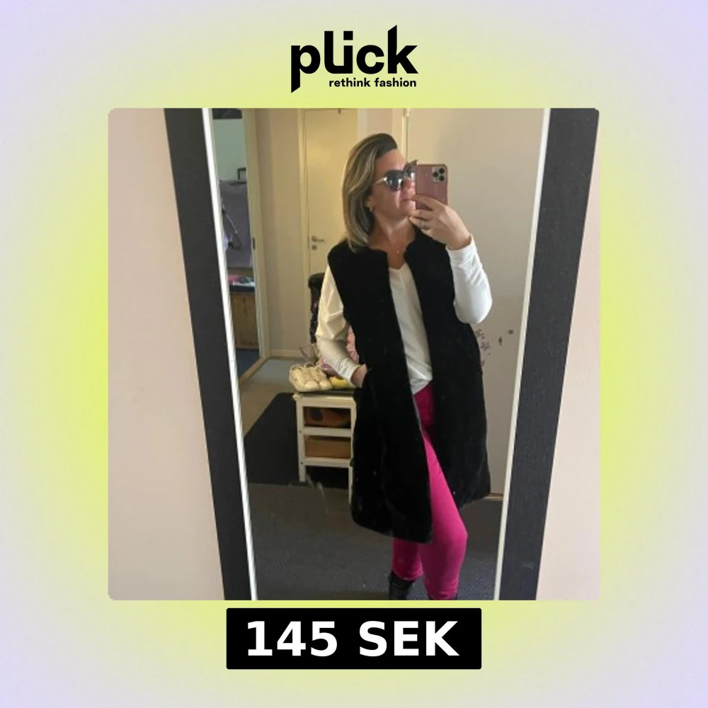 Säljer en svart lång fuskpälsväst med rak passform och diskreta fickor på sidorna. Västen är helt slät utan synliga knappar eller dragkedja och har en stilren look som passar till många outfits. Materialet är mjukt och fluffigt, vilket ger en lyxig känsla.använd bara vid ett tillfälle