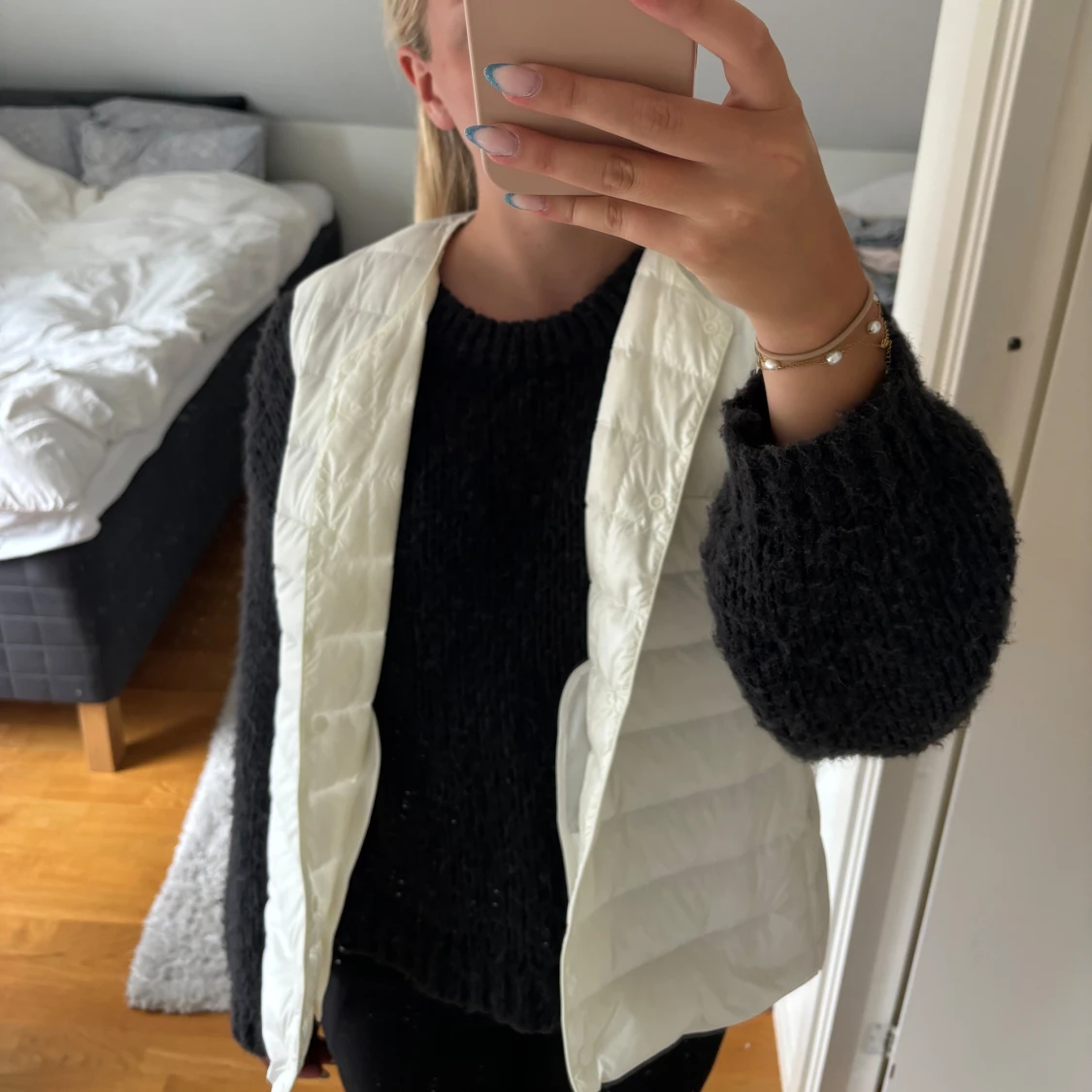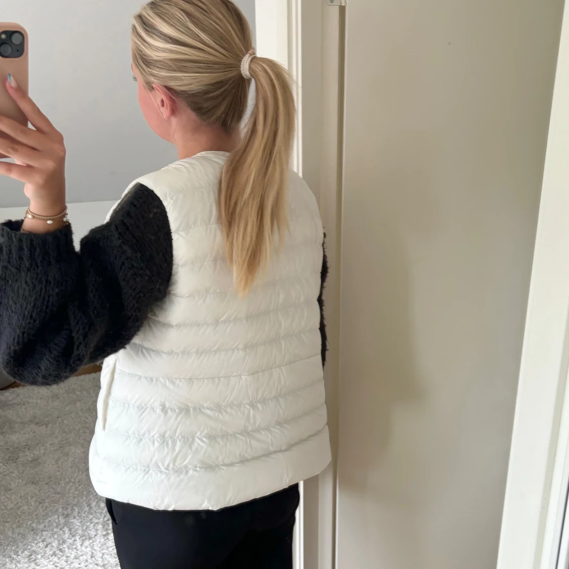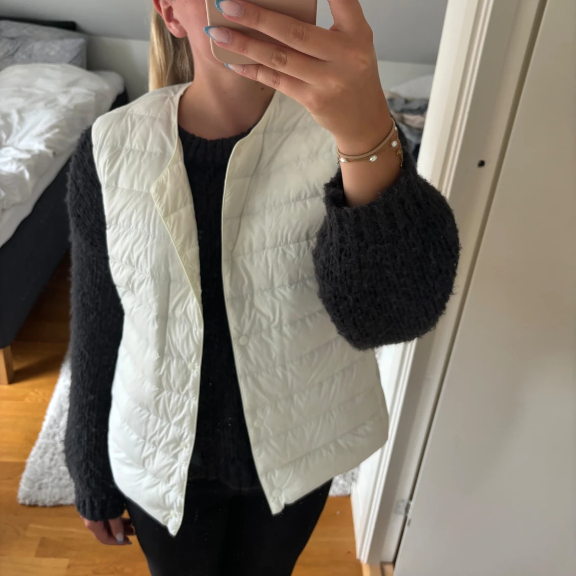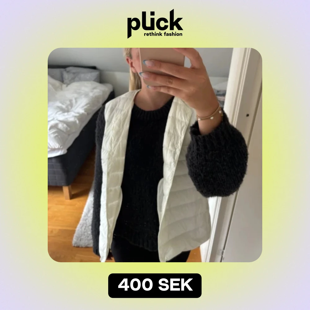 Vit dunväst som inte kommer till användning. Den har två ytterfickor och två innerfickor. ❣️Passar bra till allt. Den är väldigt tunn och inte så varm. Den har knappar som man stänger jackan med. Köptes för 700kr på uniqlo. L men liten i storlek.
