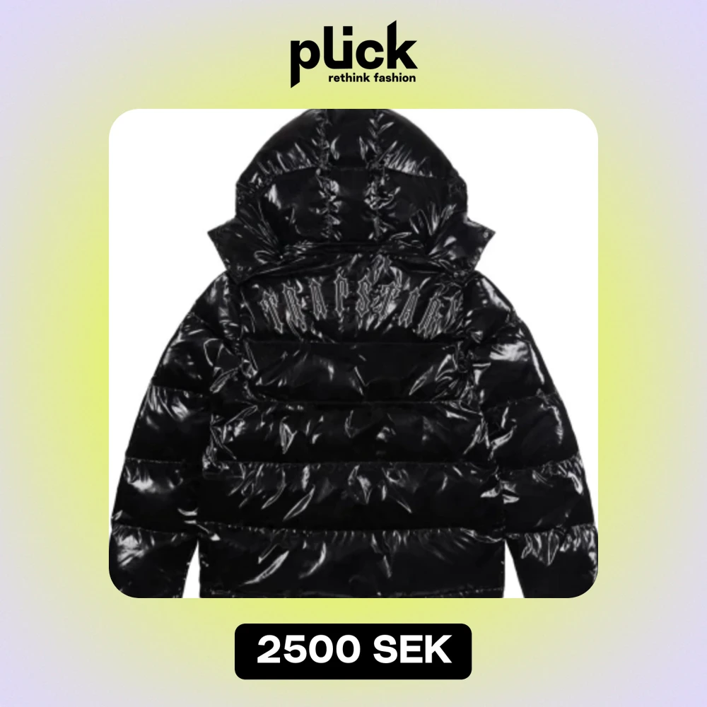 Säljer en supercool svart glansig pufferjacka med huva. Jackan har en snygg dragkedja med ett unikt T-formad dragkedjehandtag och ett märke på bröstet med texten 'Trapstar'. Perfekt för att hålla sig varm och stilren under vintern!