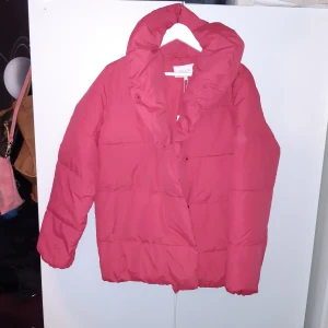 Helt ny hallonröd vinterjacka puffjacka med hög krage och tryckknappar. Strl 38 men passar 36-40 beroende på hur man vill att den ska sitta.