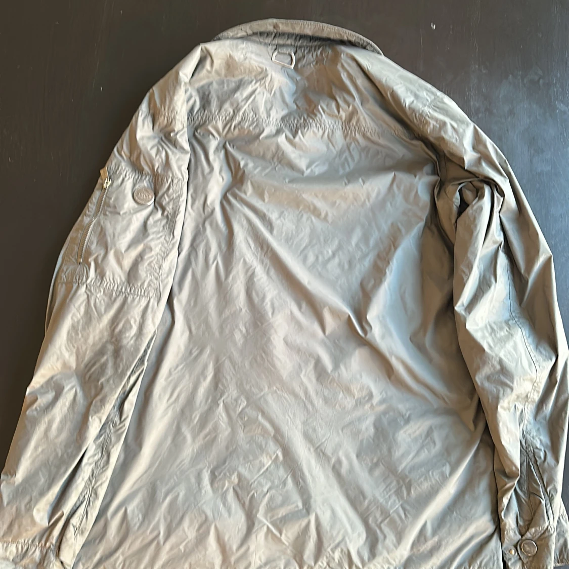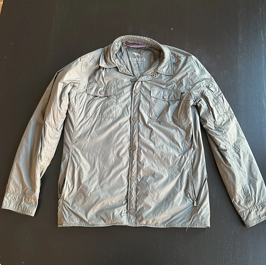 Snygg grön/grå vindjacka från Snoot Stockholm i storlek M. Jackan har klassisk krage, två bröstfickor med knappar, dragkedja framtill och på ärmen samt diskret logga på armen. Perfekt för för höster, vinter och våren. Använd ett fåtal gånger så perfekt kondition