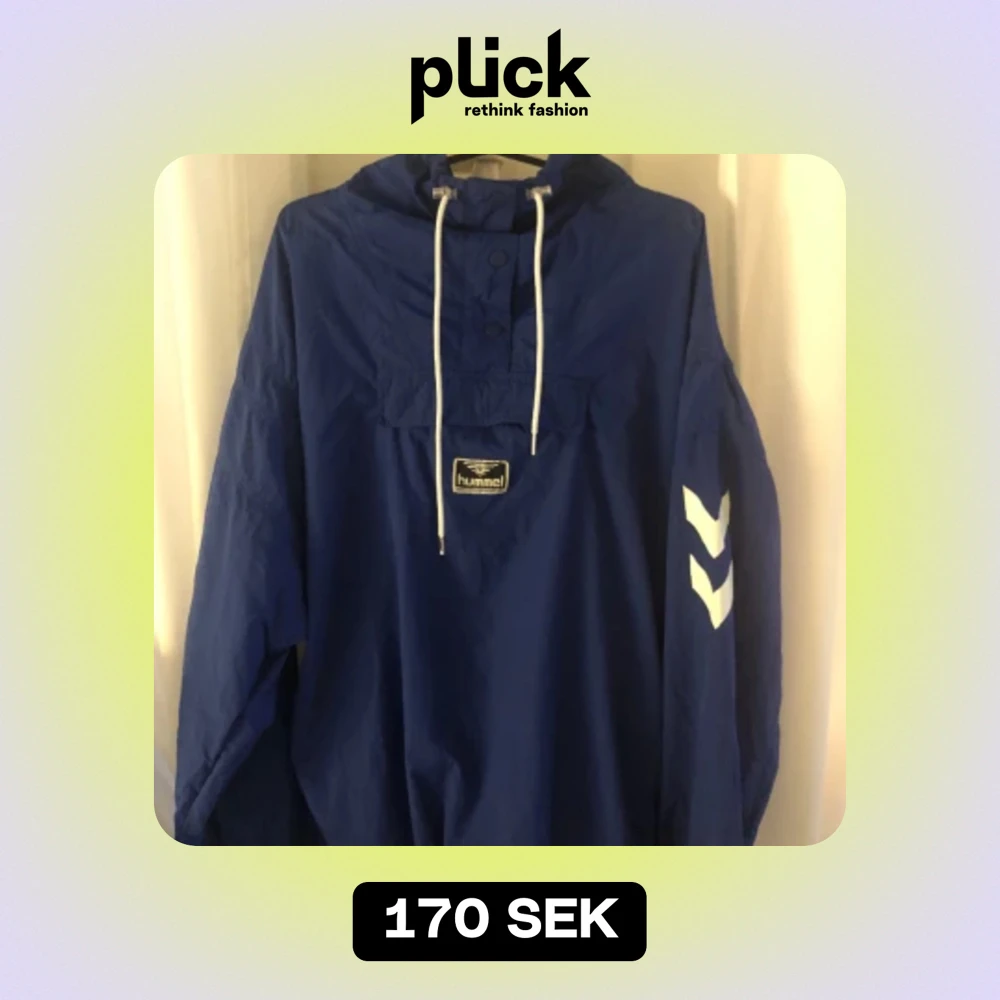 Nu säljer jag min hummel vindjacka och den har en liten skada på snörret som hänger på sidan och är lite sliten. Storleken är XL och är ganska pösig/oversized.