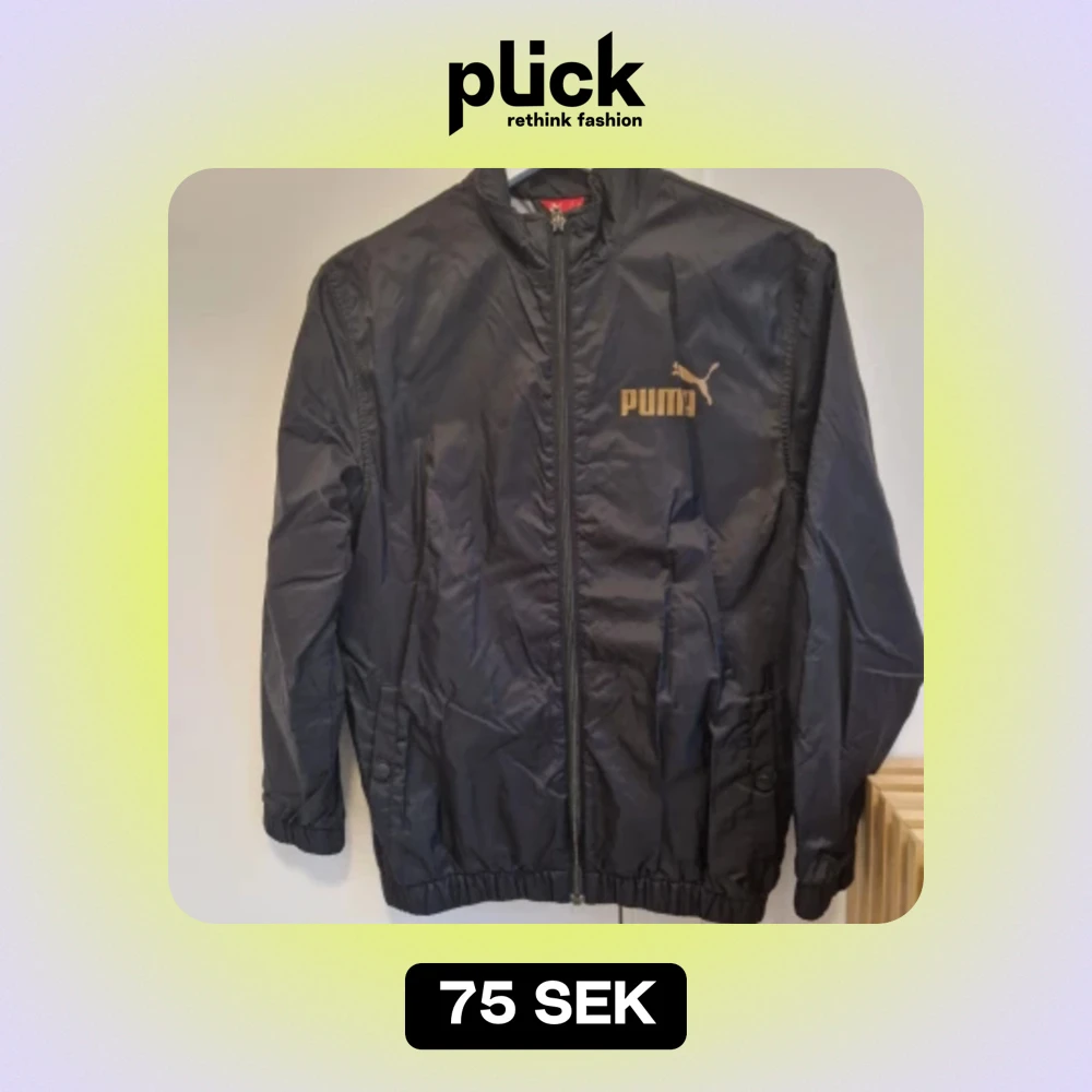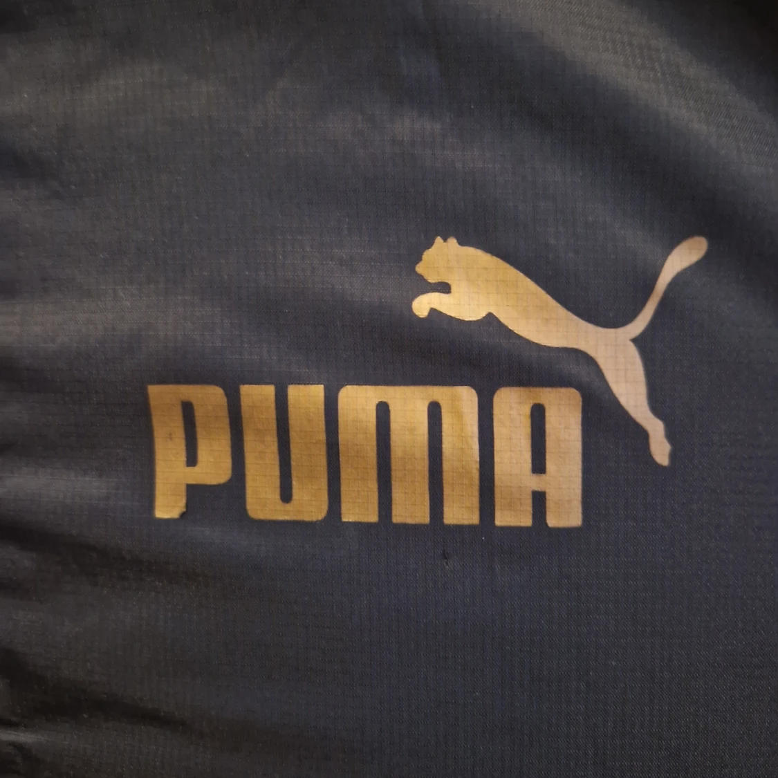 Svart vindjack med bomullsfoder i fint begagnat skick. Guldfärgat Puma tryck på bröstet. Storlek 152