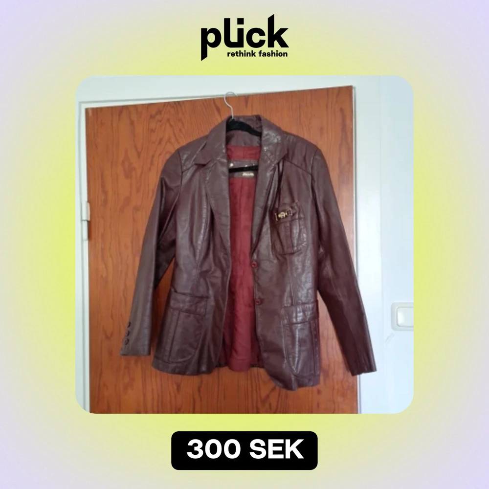 Vinröd skinn kavaj i 100% läder Oklar på storlek men skulle säga small Jag är 165 och har xs-s 34-36 i storlek som refferens Har några små slitningar se sista bilderna