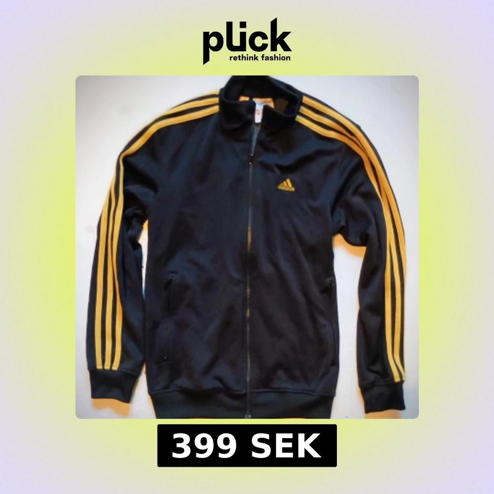 Snygg svart träningsjacka från Adidas med klassiska gula ränder längs ärmarna. Jackan har dragkedja framtill och ribbade muddar vid ärmslut och krage. Perfekt för sportiga aktiviteter eller en avslappnad stil. (Dragkedje flärpen är trasig.)