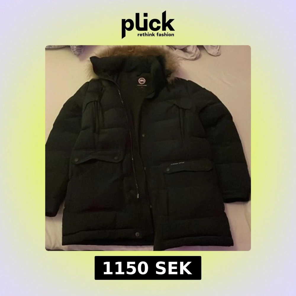Säljer en svart dunjacka från Canada Goose med pälskantad huva. Jackan har en dragkedja och knappar framtill samt flera praktiska fickor. Perfekt för kalla vinterdagar. Säljer den billigt pga av den defekten på bild 3 men kan sy ihop den innan den skickas iväg tar inte så lång tid:)