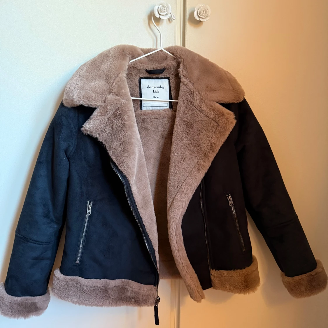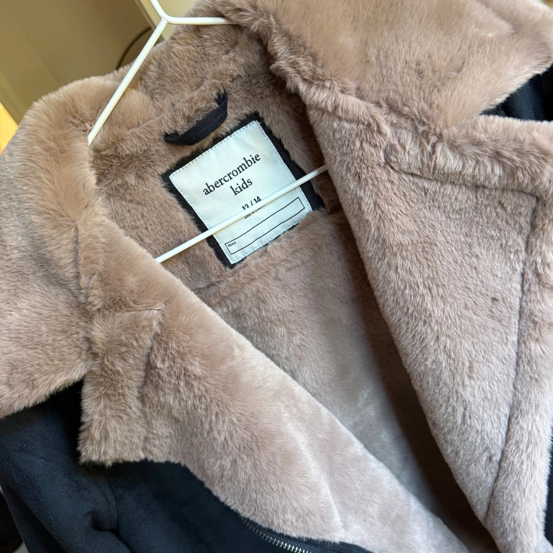 Mysig svart teddyjacka från Abercrombie Kids med bred krage och fluffigt beige foder. Jackan har dragkedja framtill, två fickor med dragkedja och uppvikta ärmslut. Perfekt för kalla dagar när du vill vara både varm och snygg. Jackan sitter bra på mig som har storlek xxs, hör av dig om du vill ha mått på jackan!