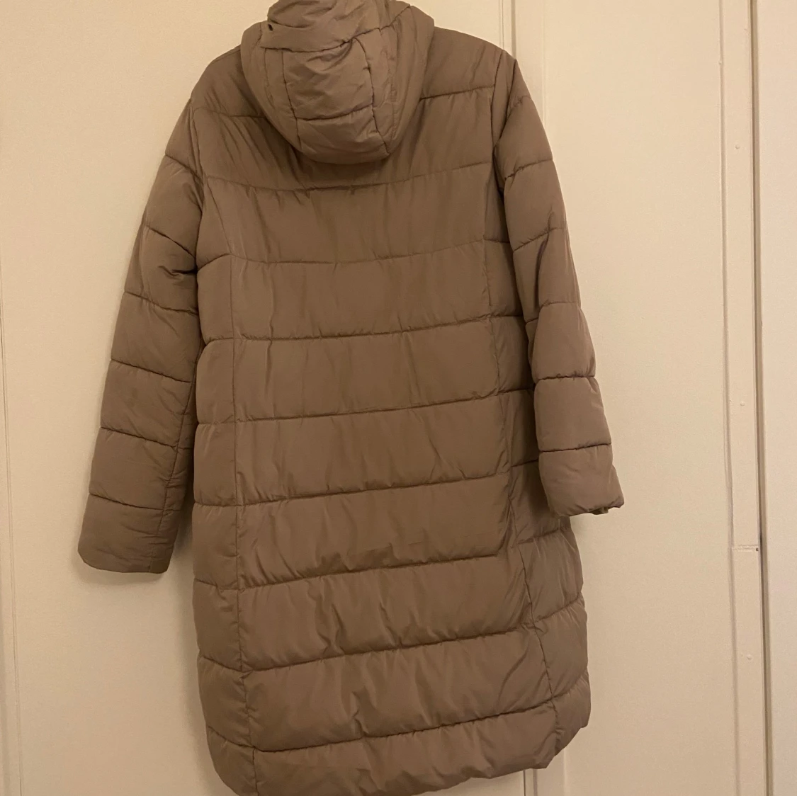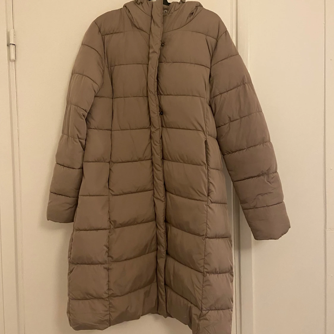 Säljer en vinterjacka från Lager 157 i storlek L, använd endast förra vintern. Jackan är beige/khaki och lång, perfekt för vintern. Den har både dragkedja och knappar för extra skydd, samt en luva som håller dig varm. Jackan är i mycket bra skick! 😊