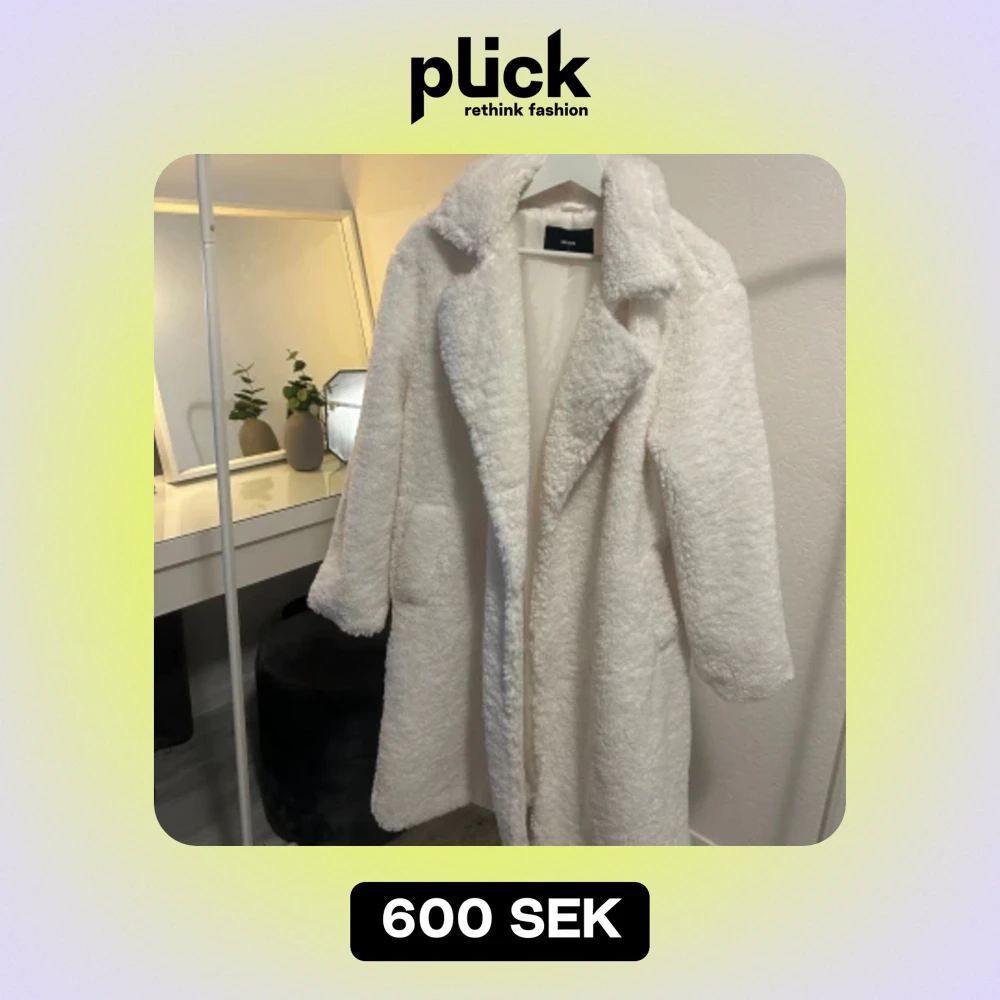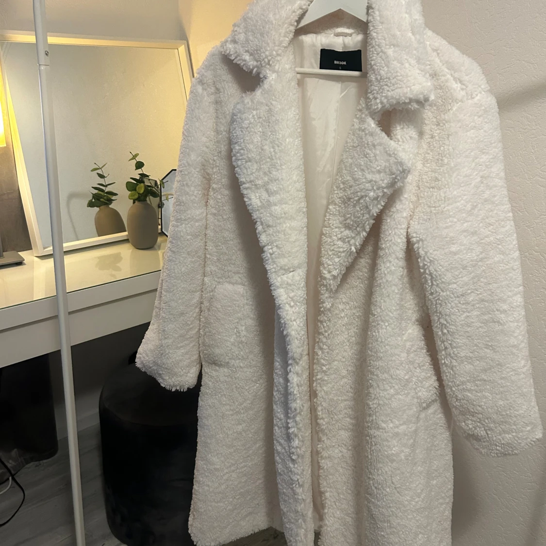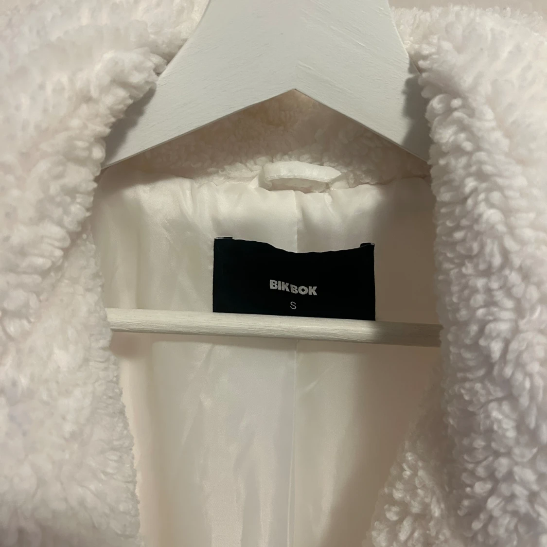 Vit lång ”teddy” kappa från BikBok 🤍❄️ Aldrig använd! Köpt för 899kr, men säljer för 600kr.