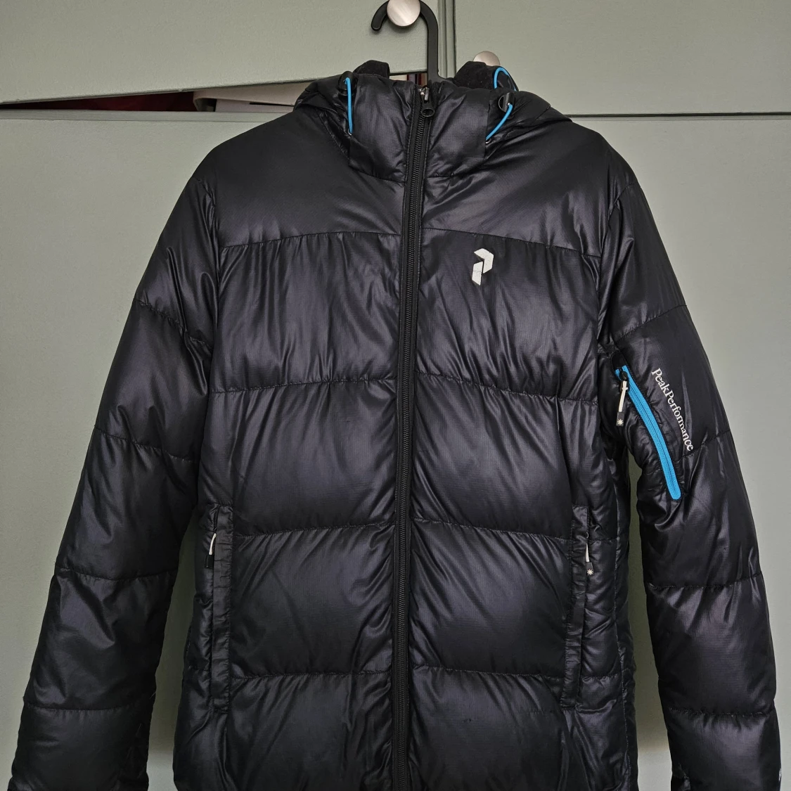 Säljer en svart pufferjacka från Peak Performance i storlek S. Jackan har huva, blå detaljer vid dragkedjor och logga på bröstet samt ärmen. Perfekt för kalla dagar och har en sportig vibe. Flera fickor med dragkedja och riktigt skön passform.