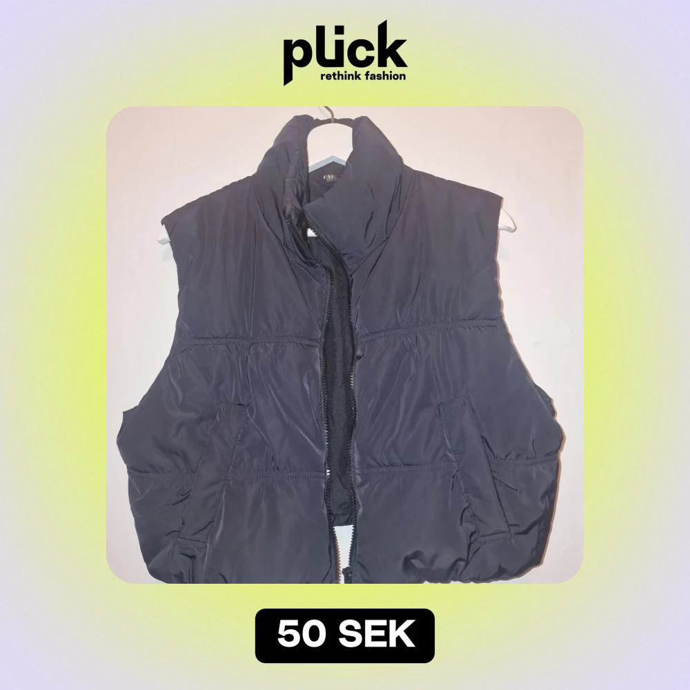 Säljer en svart väst från H&M med dragkedja framtill. Västen har en hög krage och två fickor på sidorna. Perfekt för att snygga till din outfit!Garderobsrensning så kika gärna in övriga auktioner.