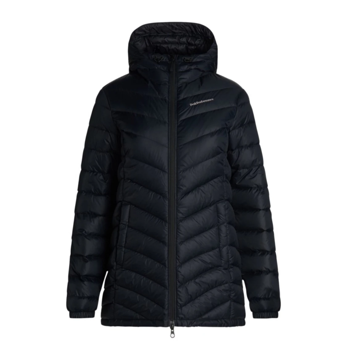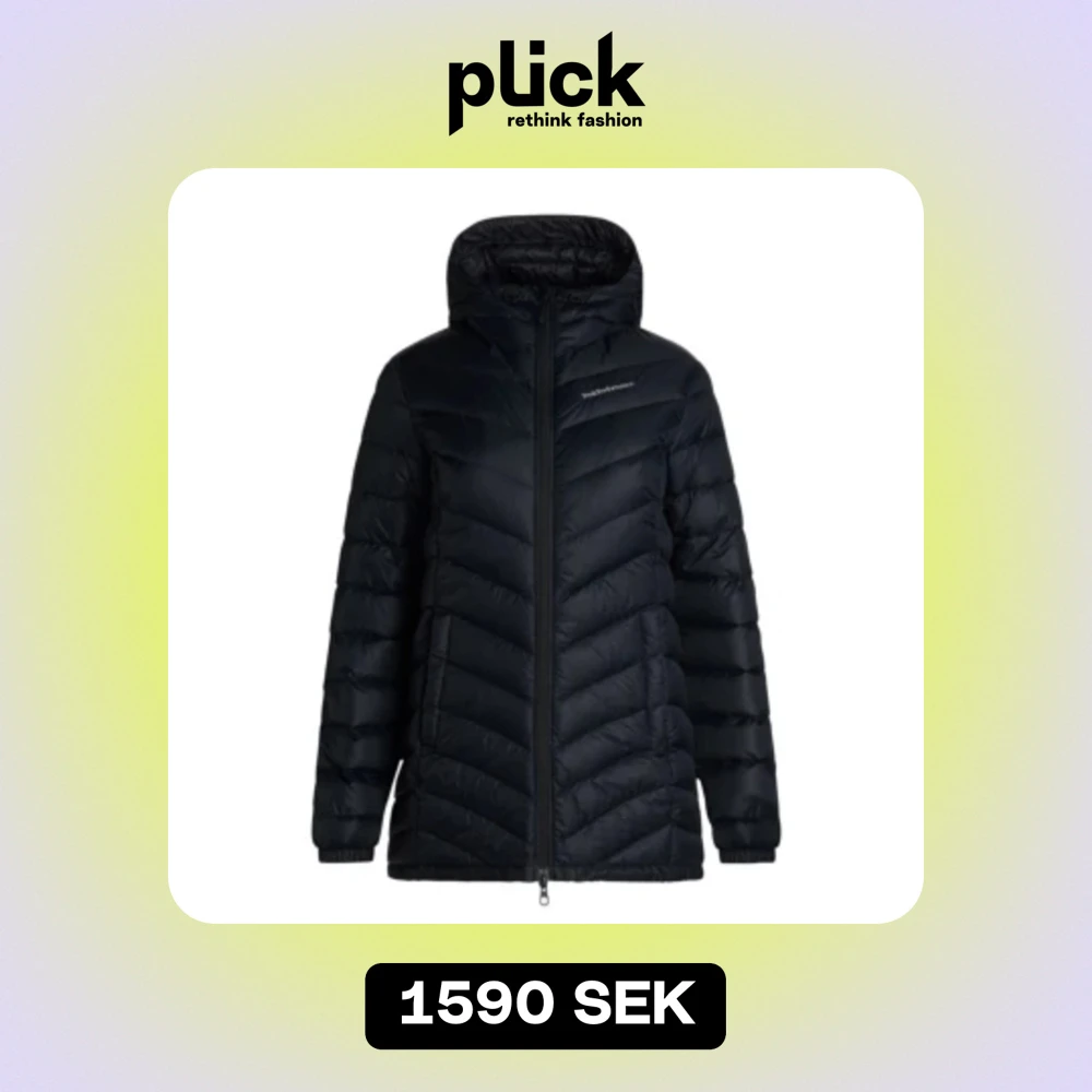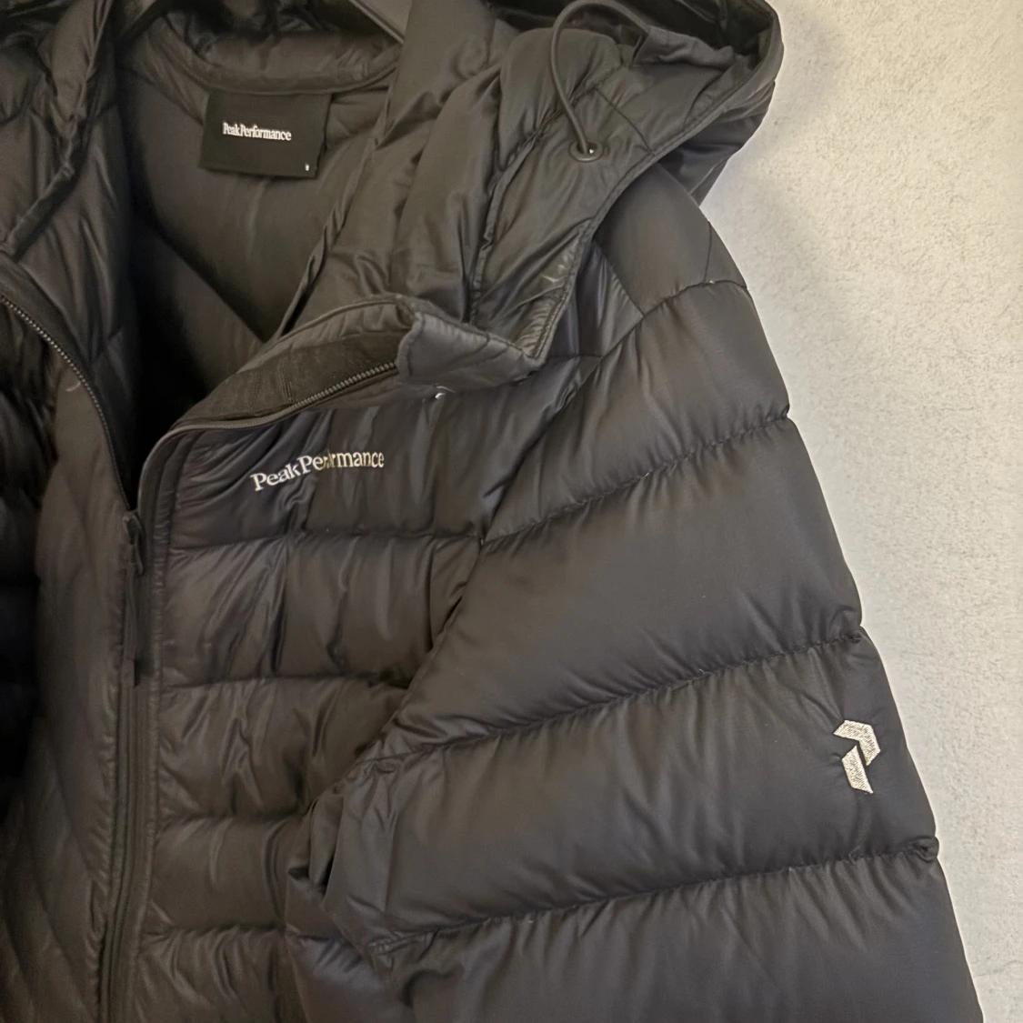 En svart peak performance jacka, nyskick, går precis ner till knäna och är köpt för 3500kr🩷