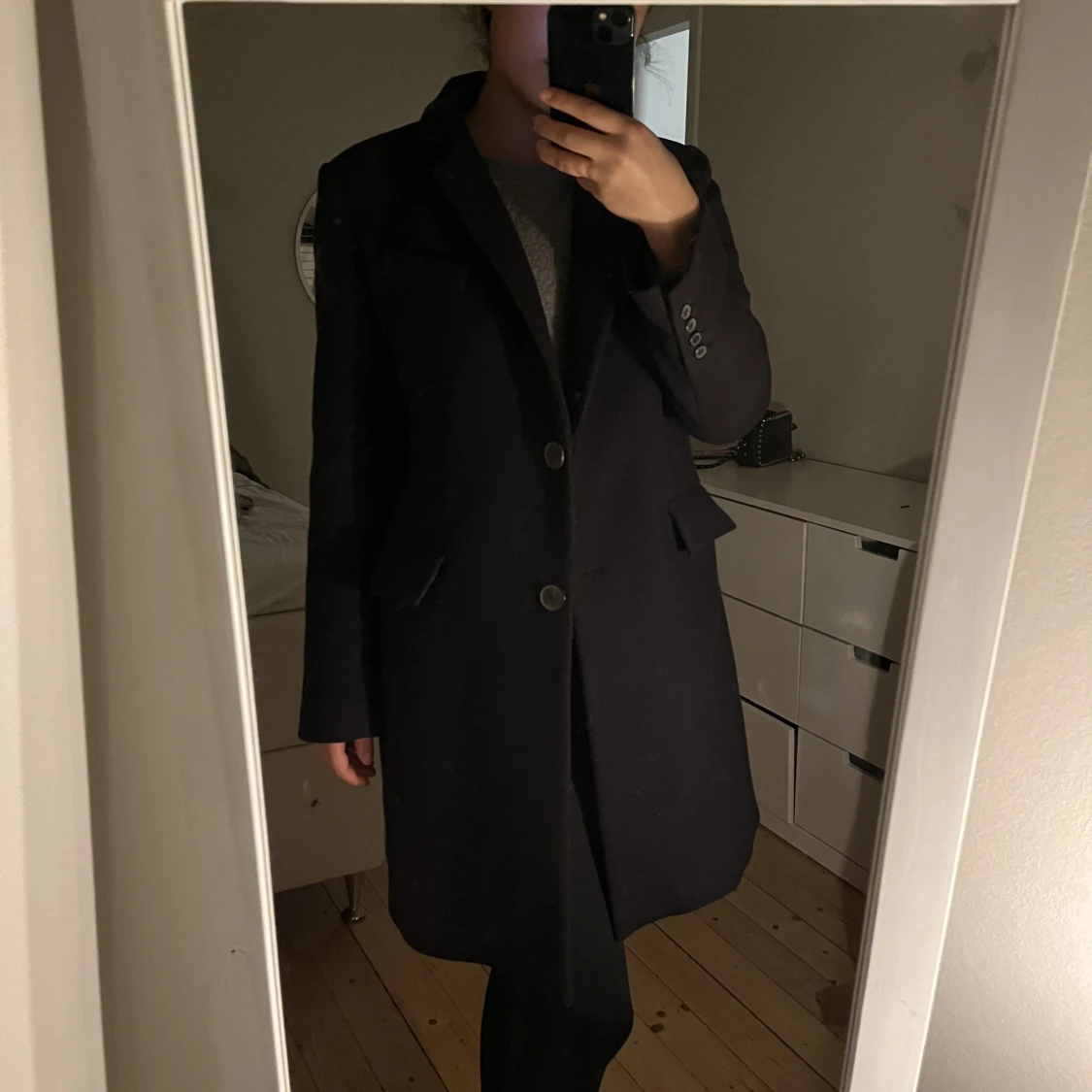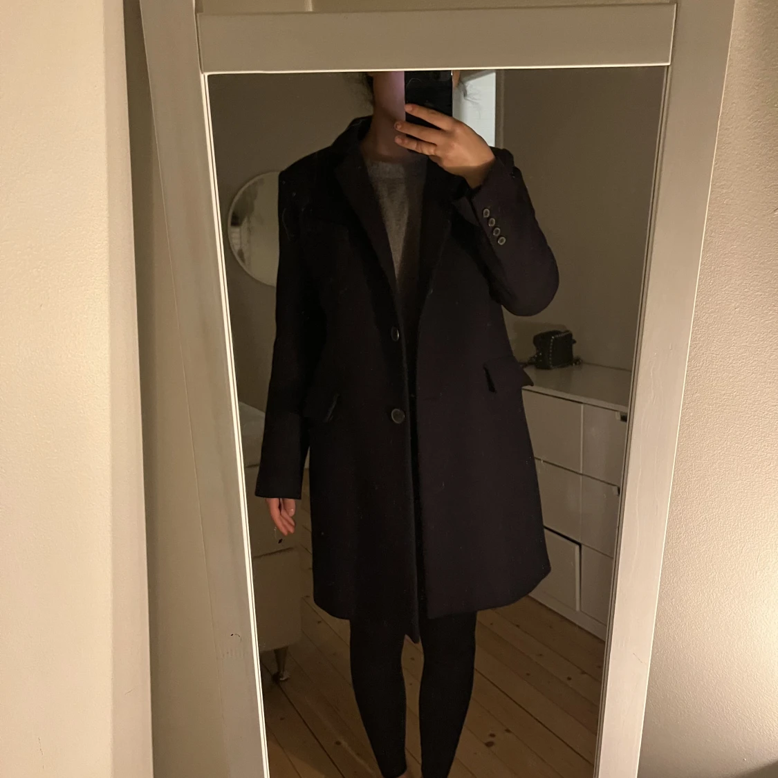 En jättefin zara kappa i färgen mörkblå. Väldigt fint skick! Storlek L men passar M också.