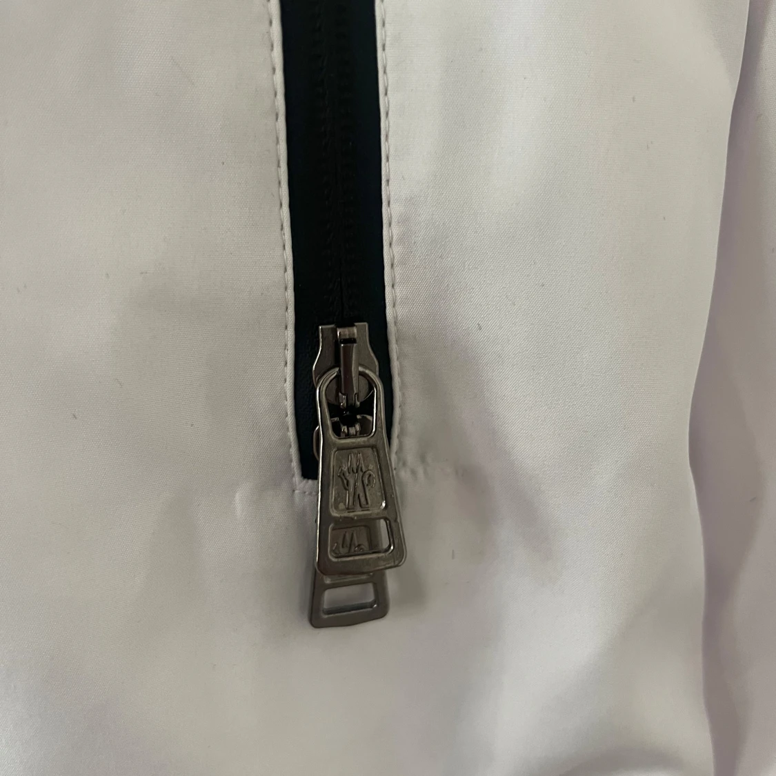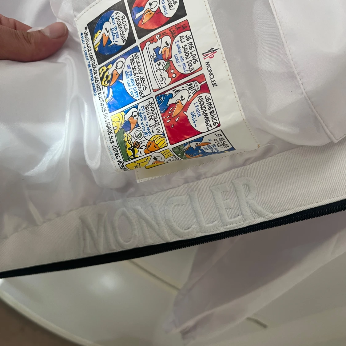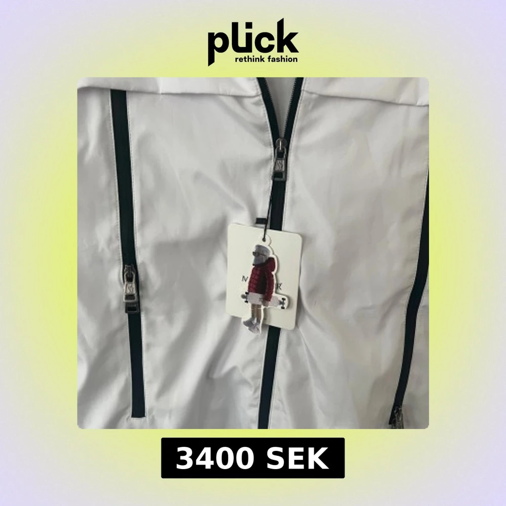Säljer en snygg vit dunjacka från Moncler med dragkedja och coola detaljer. Jackan har en broderad logga och en unik serietidningsdesign på insidan. Perfekt för kyliga dagar!