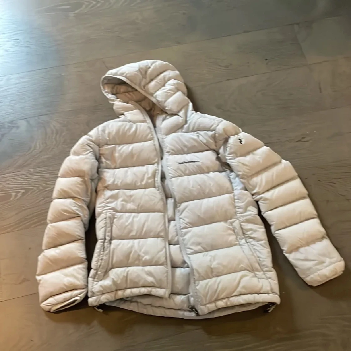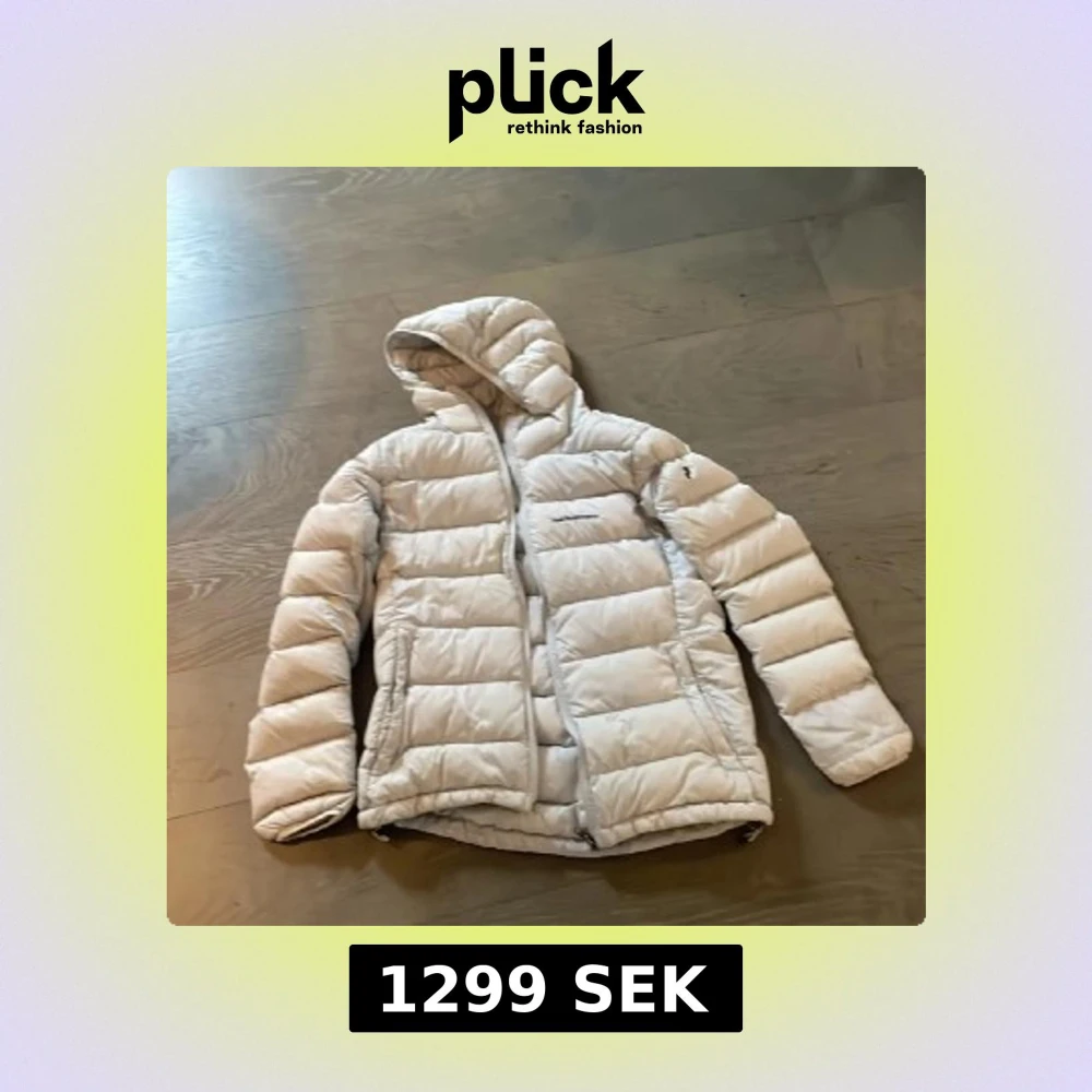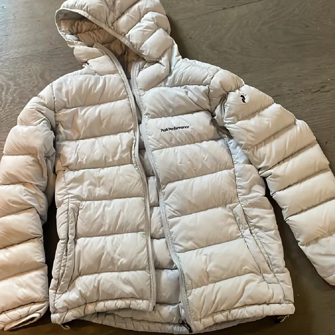 Snygg vit/grå dunjacka från Peak Performance med huva och dragkedja. Jackan är quiltad och har två fickor med dragkedja samt logga på bröstet och ärmen. Perfekt för kalla dagar och riktigt skön att bära. Passar även XS/S. Inga defekter vad jag kan se😊
