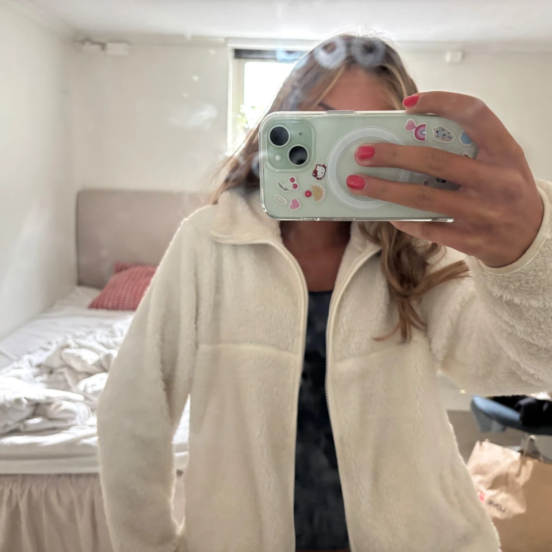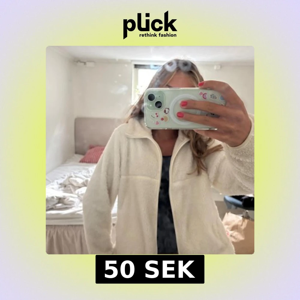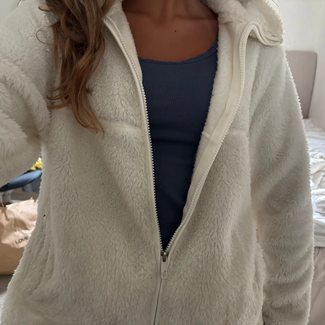 Mysig vit teddyjacka i fluffigt material med hel dragkedja framtill och hög krage. Så mysig flis till hösten. Jackan har lång ärm och två sidofickor, perfekt för lager-på-lager. Enkel och stilren design som passar till många outfits.
