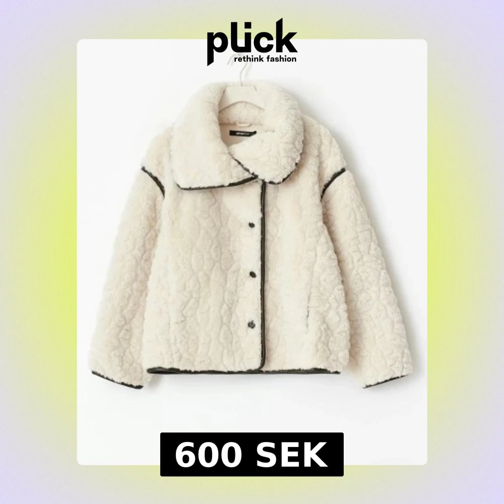 Säljer en fluffig vit teddyjacka från Gina Tricot med svarta detaljer längs kanterna och stora krage💖