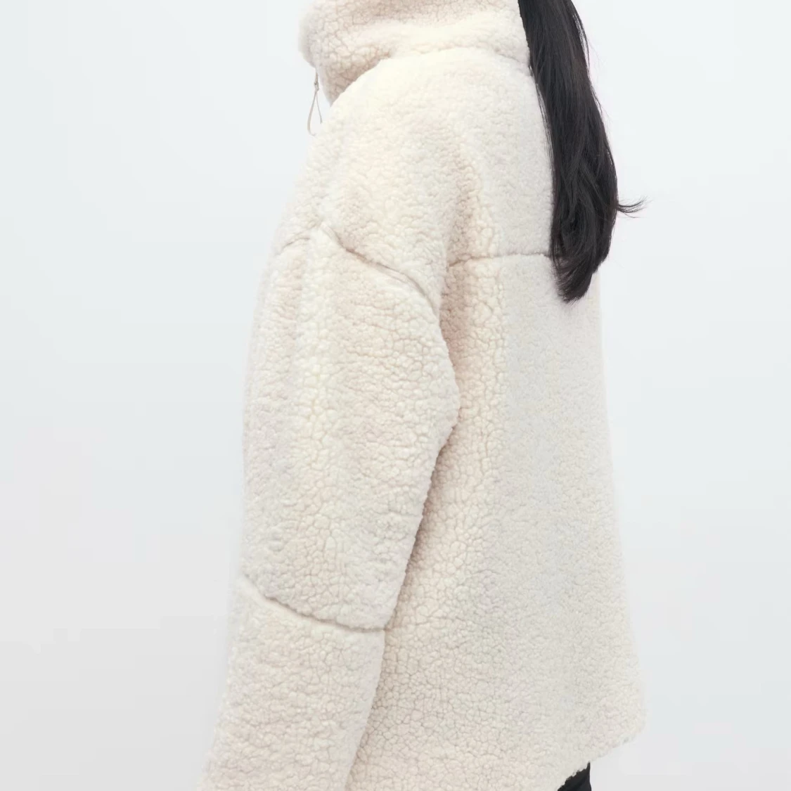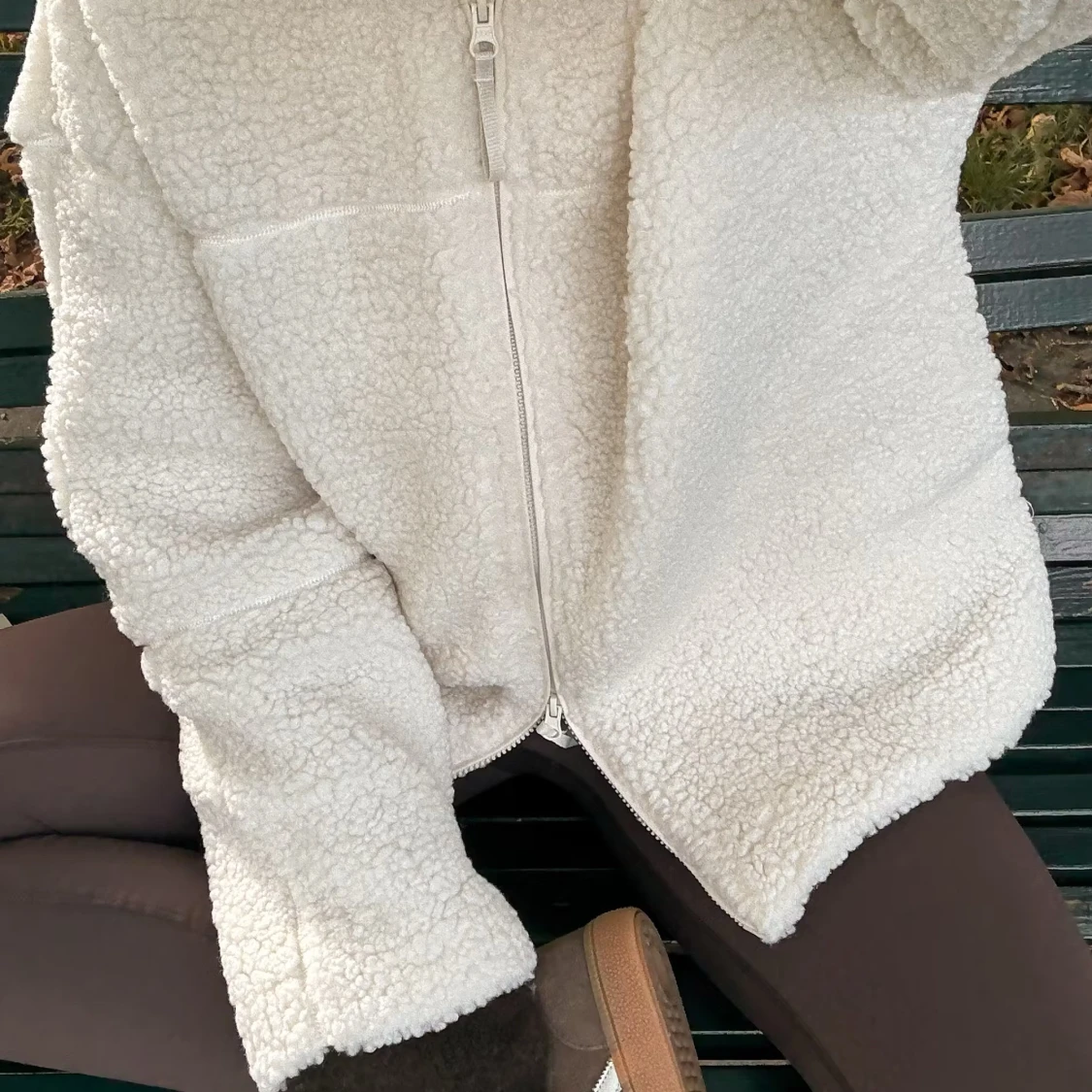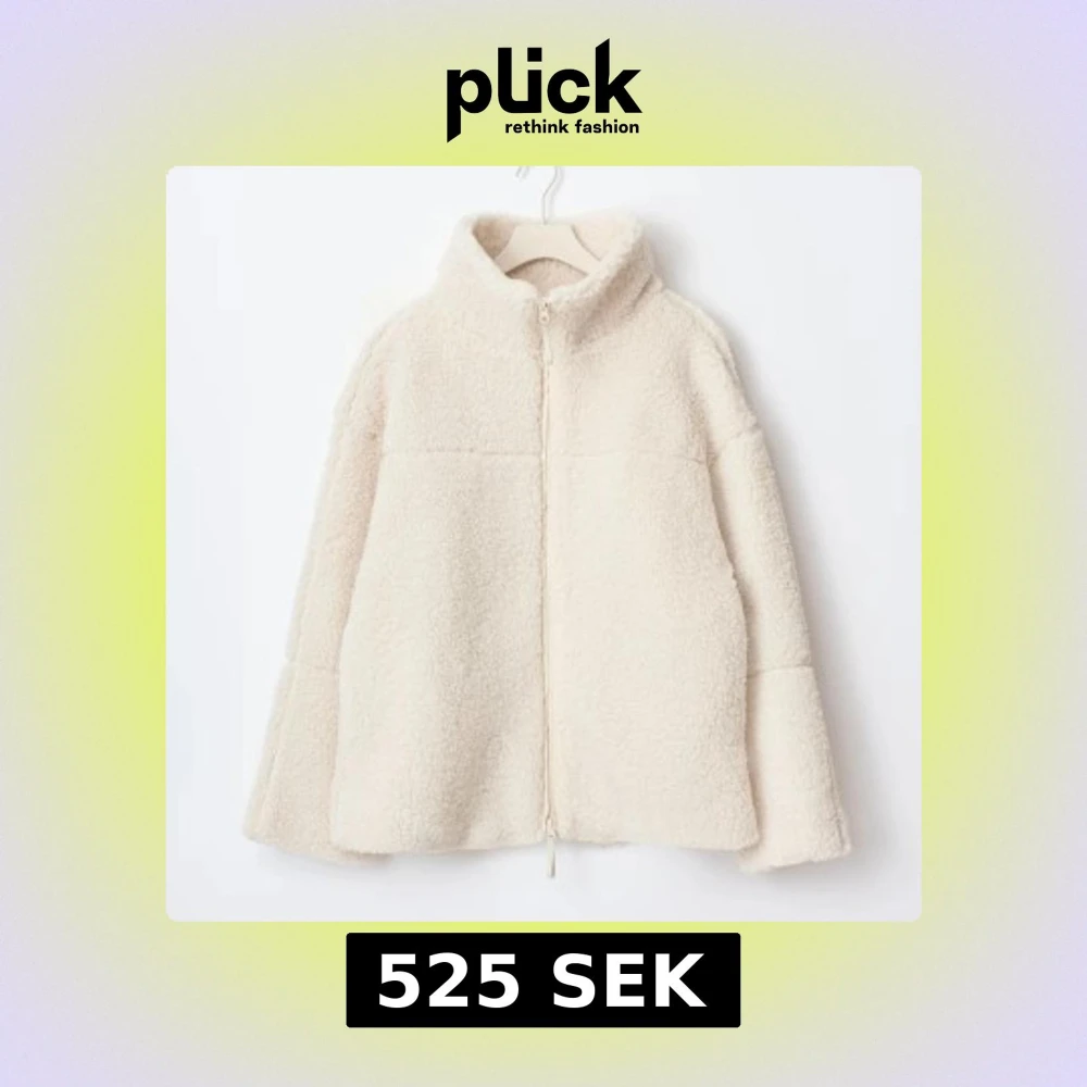Mysig teddyjacka i vitt med hög krage och hel dragkedja framtill. Jackan har en loose passform och är tillverkad i mjukt fleece-liknande material som håller dig varm under kyliga dagar. Perfekt för lager-på-lager och enkel att styla till olika outfits. Aldrig använt