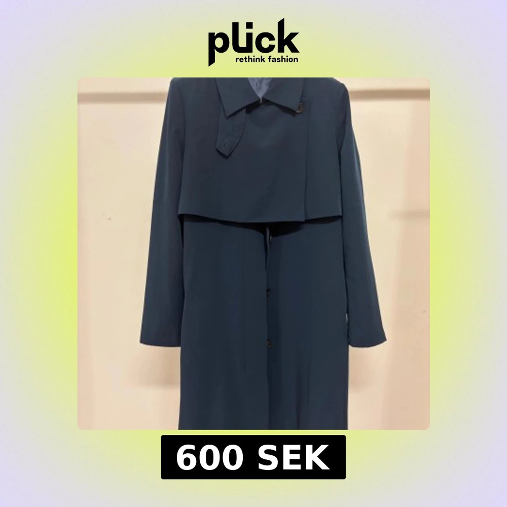 Snygg mörkblå trenchcoat från Whyred med klassisk krage, knappar framtill och knytband i midjan. Jackan har långa ärmar och ett stilrent, minimalistiskt uttryck. Perfekt för dig som gillar clean och tidlös design.