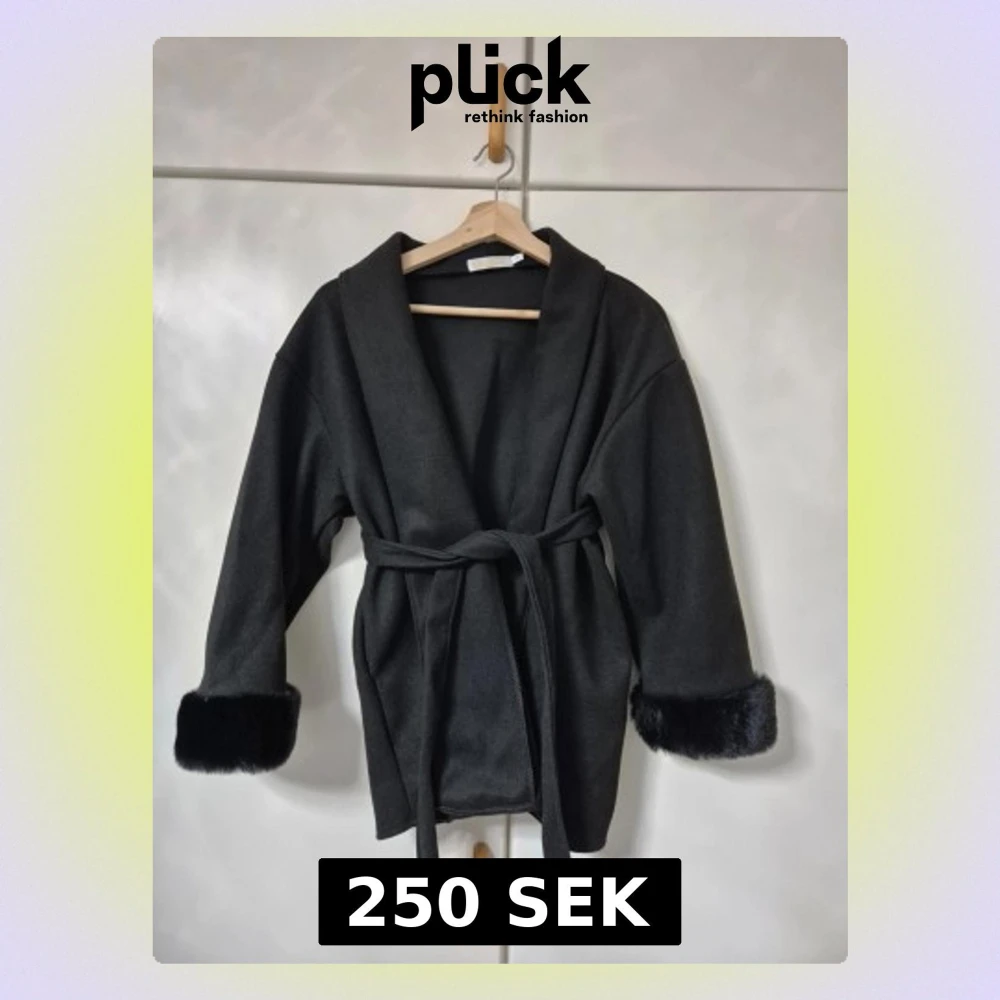 Snygg svart kappa med bred krage och bälte i midjan. Ärmarna har lyxiga fuskpälsdetaljer vid muddarna som ger en extra touch. Perfekt för dig som vill ha en stilren och trendig look under kyliga dagar.