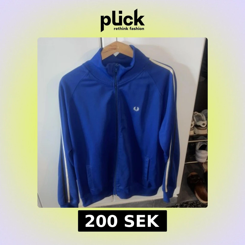 Säljer en blå track jacket från Fred Perry med vita ränder längs ärmarna och dragkedja framtill. Jackan har ribbad krage, muddar och nederkant samt två fickor. Klassisk logga broderad på bröstet.