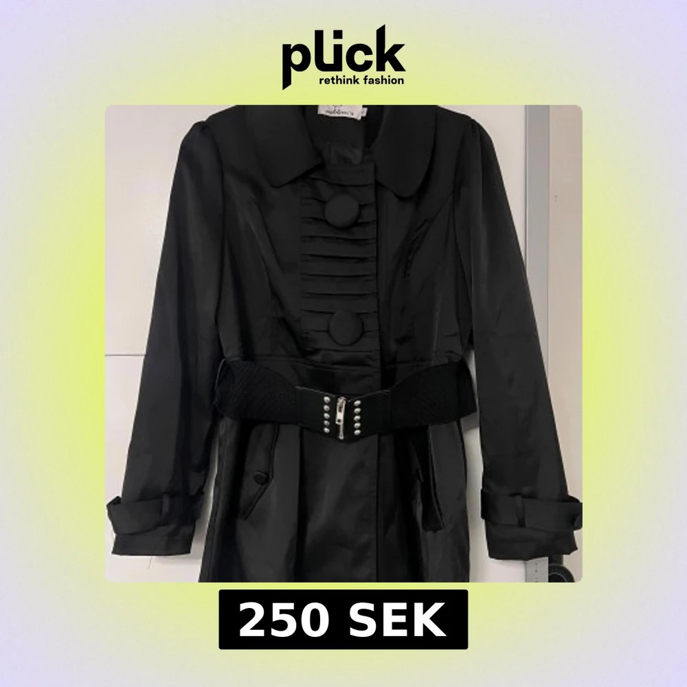 Svart trenchcoat med stora klädda knappar, bred krage och dekorativa veck framtill. Jackan har ett brett elastiskt bälte med nitar och dragkedja, samt detaljerade manschetter. Snygg och stilren modell. Bältet går att ta av. Aldrig kommit till användning.