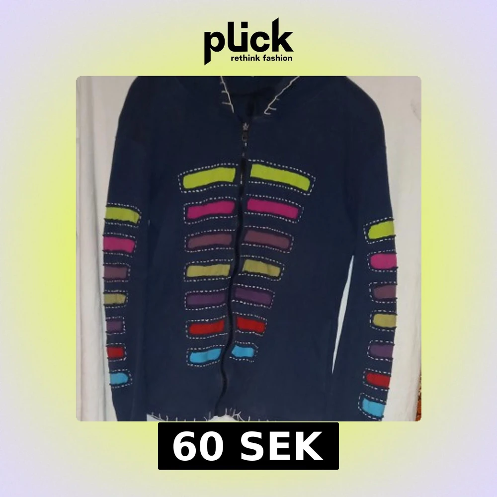 Säljer en unik mörkblå jacka från Sol & måme el vad de nu står, med färgglada, broderade detaljer i rosa, grönt, rött och blått. Jackan har en dragkedja framtill och långa ärmar med mönster och annorlunda huva med tofs. Perfekt för dig som vill sticka ut!