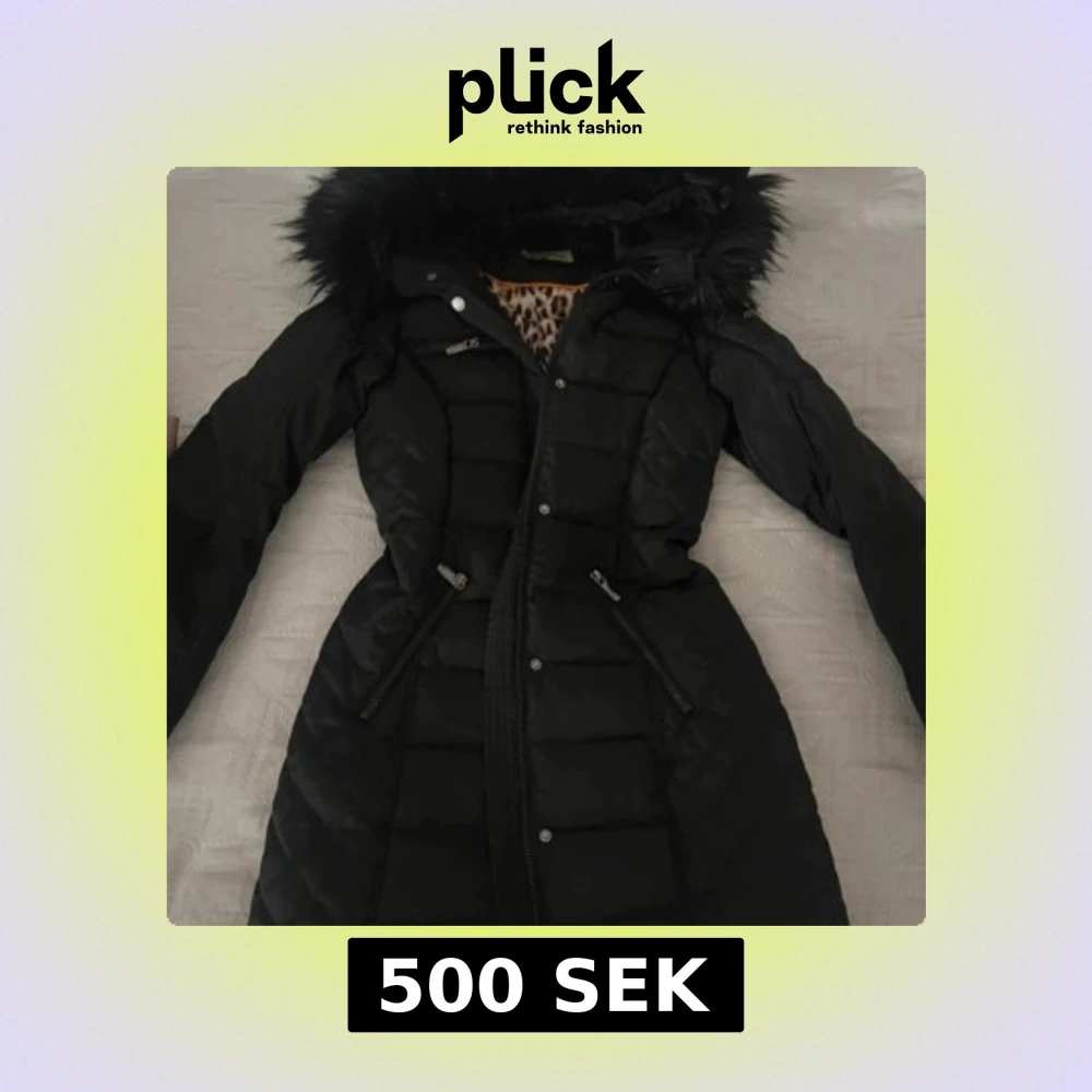 Snygg svart dunjacka med leopardmönstrat foder och pälskantad huva. Jackan har dragkedja och knappar framtill samt praktiska fickor med dragkedja. Perfekt för kyliga dagar! Har lite fläckar som syns på sista bilden annars är den perfekt