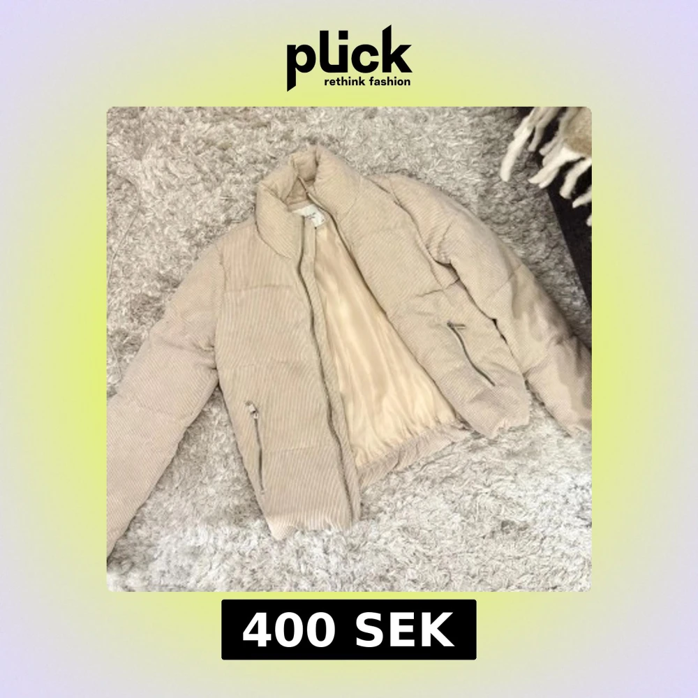 Säljer en beige pufferjacka med mjuk manchester med diskreta ränder. Jackan har hög krage, två fickor med dragkedja och hel dragkedja framtill. Perfekt för kyliga dagar och ger en clean och trendig look.