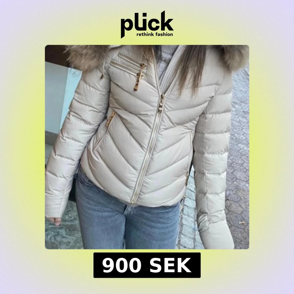 Snygg beige pufferjacka från Hollies med stor fluffig fuskpäls på huvan och guldiga dragkedjor. Jackan har flera fickor med dragkedja och en snygg badge på ärmen. Perfekt för kalla dagar och ger en riktigt lyxig vibe.