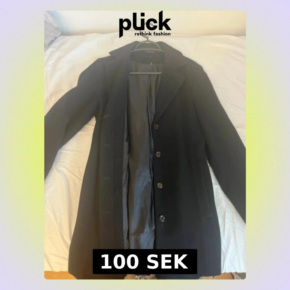 Säljer en svart, lång och stilren ullkappa med knappar framtill och två fickor. Kappan har en klassisk krage och är helfodrad för extra komfort. Perfekt för dig som vill ha en tidlös och snygg jacka till höst och vinter.