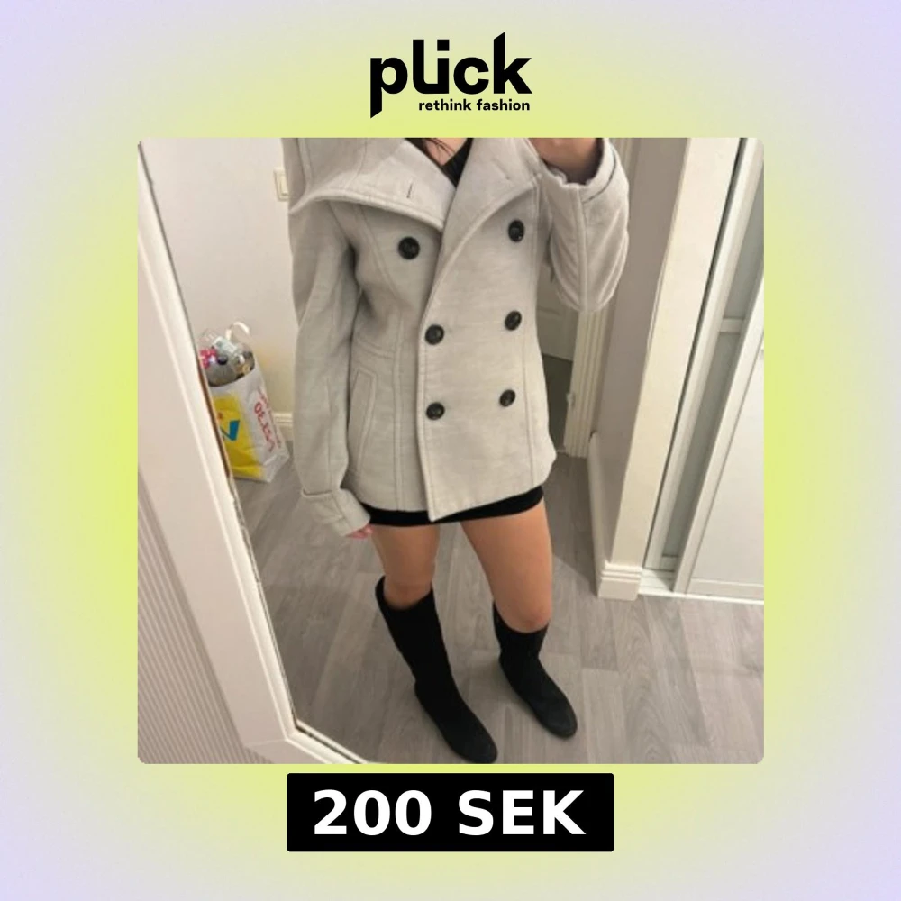 Snygg ljusgrå skepparkavaj med dubbelknäppning och stora svarta knappar. Jackan har bred krage, två fickor framtill och markerade sömmar. Perfekt för dig som vill ha en stilren och klassisk look under höst och vinter.