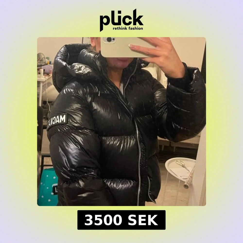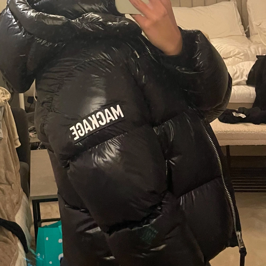 Snygg svart pufferjacka från Mackage med glansigt material och dragkedja framtill. Jackan har en stor huva och långa ärmar, perfekt för kyliga dagar. Märkeslogga synlig på ärmen.