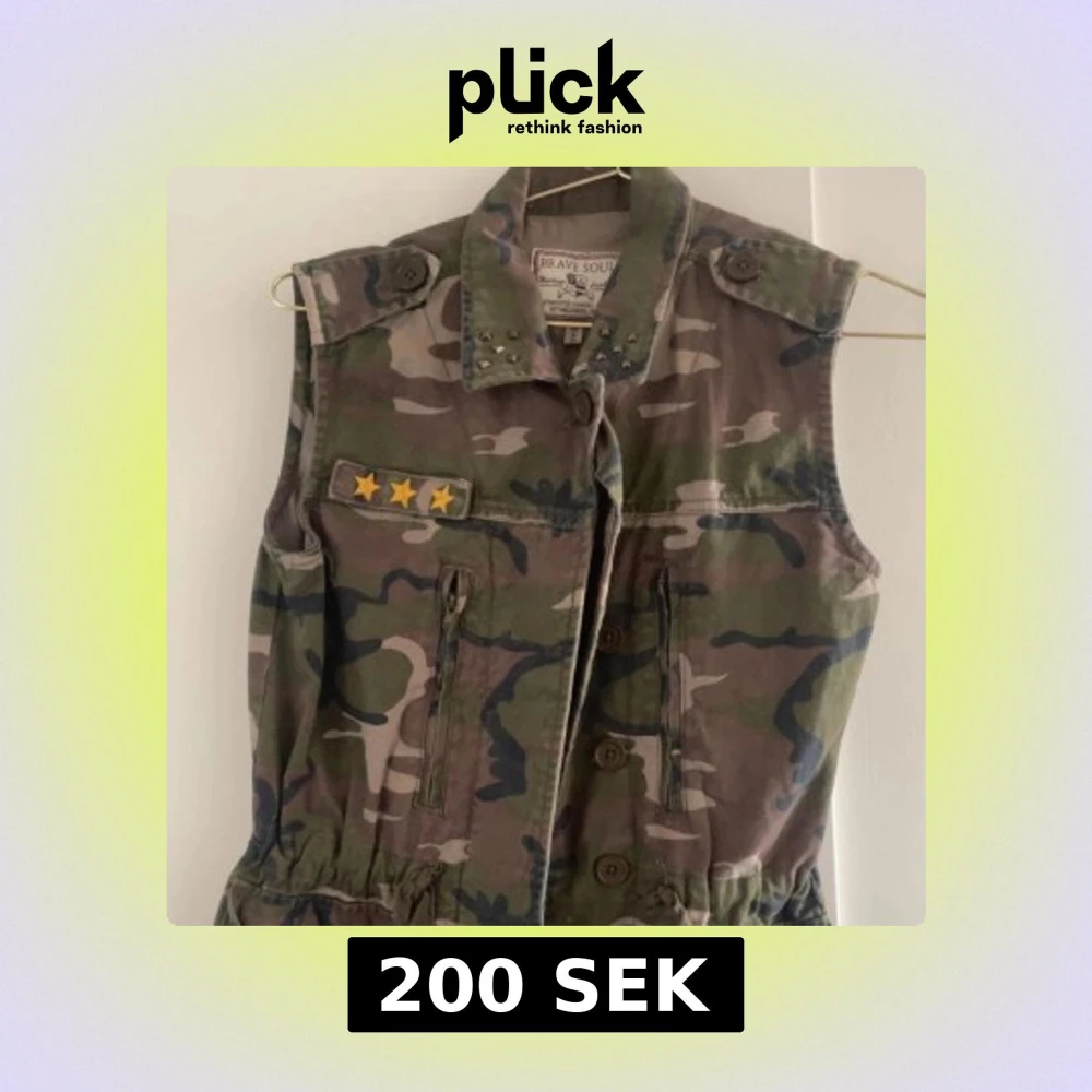 Snygg camouflageväst från Brave Soul med coola stjärndetaljer och nitar på kragen. Västen har knappar framtill och praktiska fickor. Det är storlek 36/XS