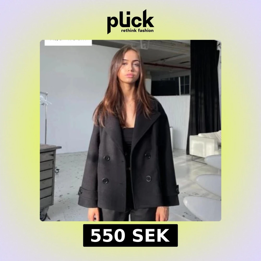 Snygg svart kappa med dubbelknäppning och bred krage. Skriv om du vill se fler bilder