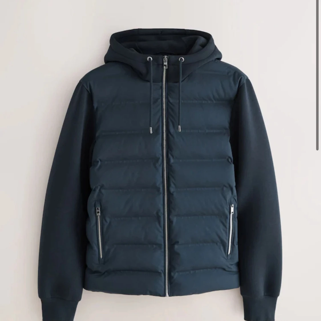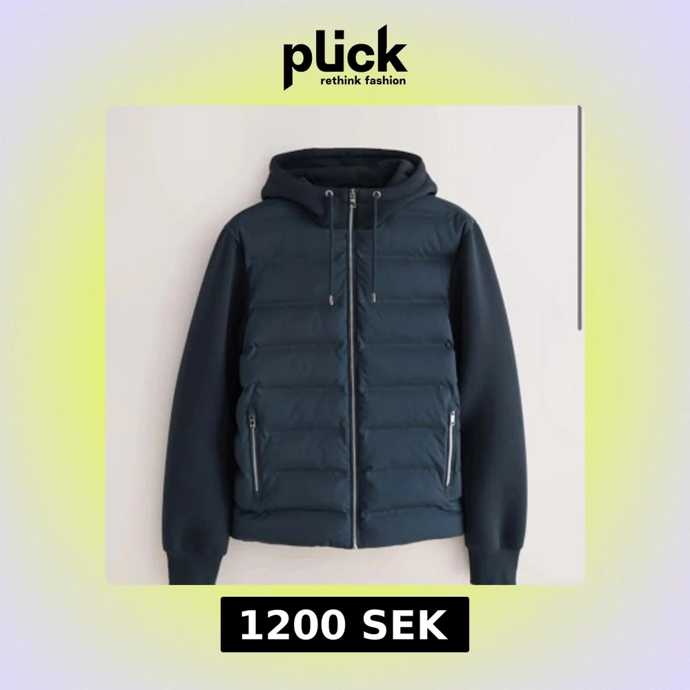 Snygg mörkblå pufferjacka med huva och dragkedja framtill. Jackan har quiltad front, släta ärmar och två fickor med dragkedja. Perfekt för kyliga dagar. Såldes ut snabbt.