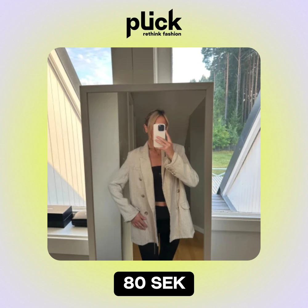 Säljer en snygg beige linnekavaj med dubbelknäppning. Den har en klassisk stil med långa ärmar och två fickor framtill. Perfekt för både vardag och fest!