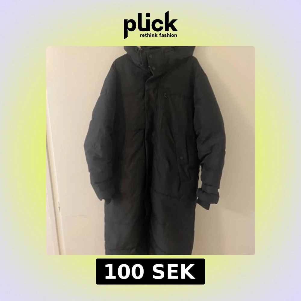 Säljer en svart lång dunjacka med huva. Jackan har en dragkedja som är dock sönder men det finns knappar framtill och långa ärmar. Perfekt för kalla dagar när du vill hålla dig varm och bekväm.