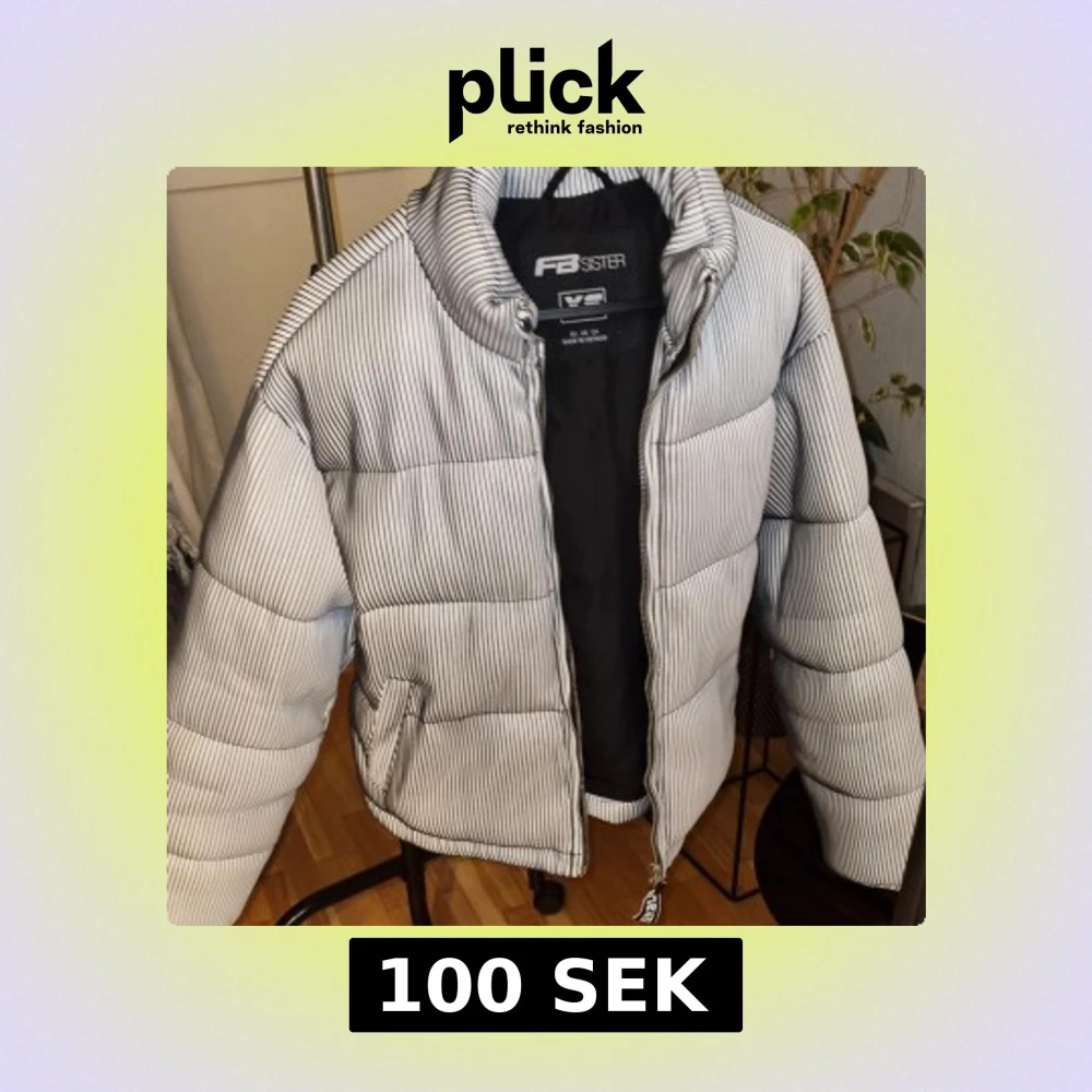 Snygg pufferjacka från FB Sister i storlek XS. Jackan är vit med svarta tunna ränder, har dragkedja framtill och två fickor. Perfekt för dig som vill ha en cool och trendig look under kyliga dagar.