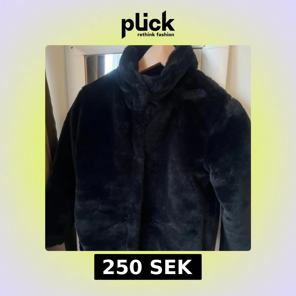 Säljer en stilren svart pälsjacka med långärmad design. Jackan ger en lyxig känsla. Den har en enkel och elegant look utan synliga detaljer som dragkedjor eller knappar.