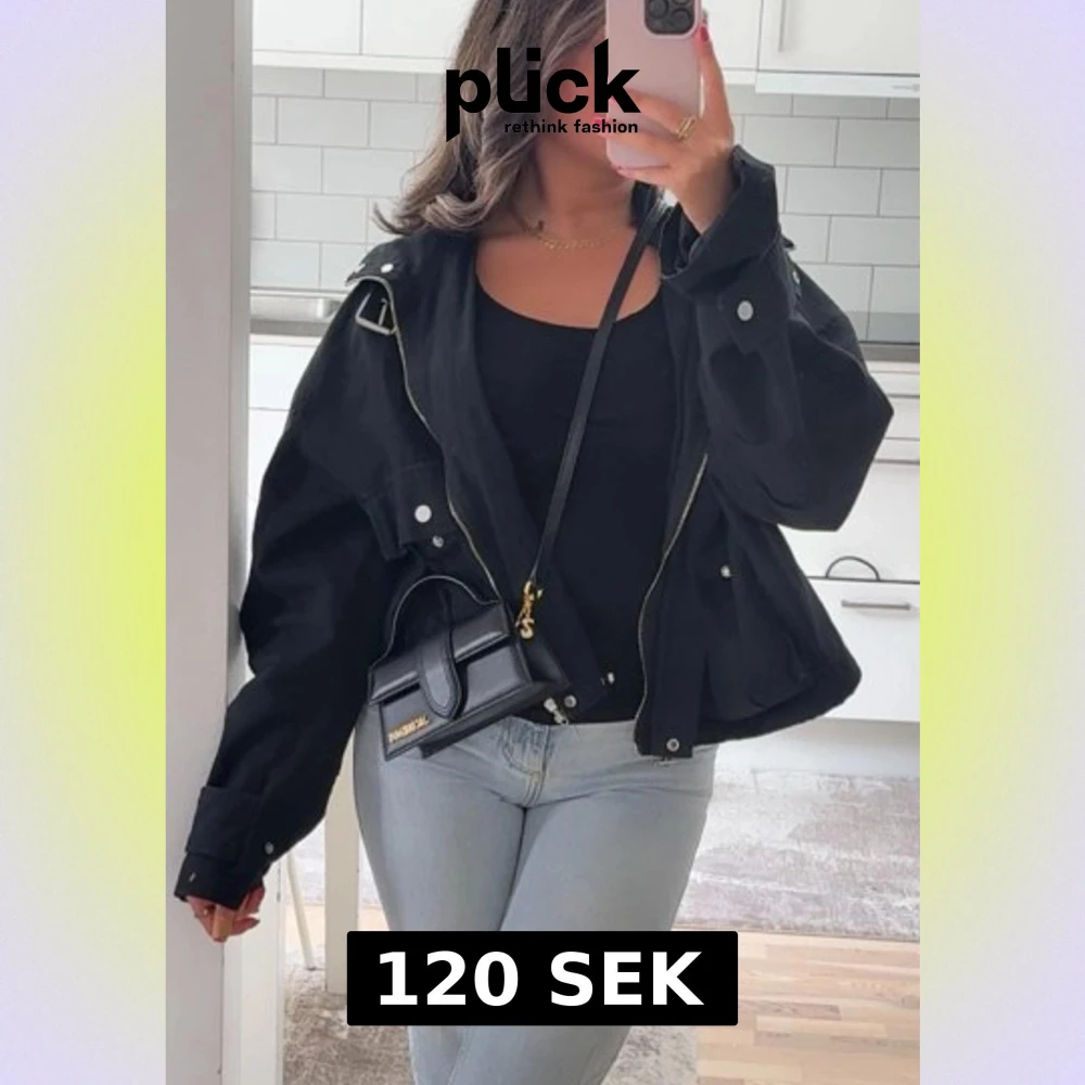 Svart bomberjacka med coola detaljer som silverfärgad dragkedja, stora fickor med knappar och spänne vid kragen. Jackan har en loose passform och är perfekt att slänga över en outfit för en trendig look. Materialet känns som polyester och jackan är långärmad.
