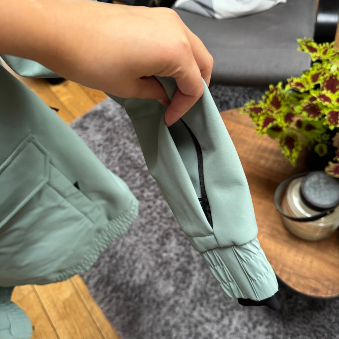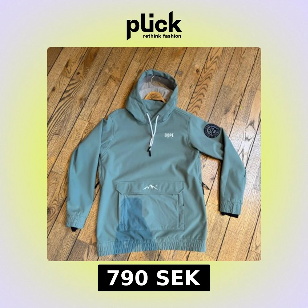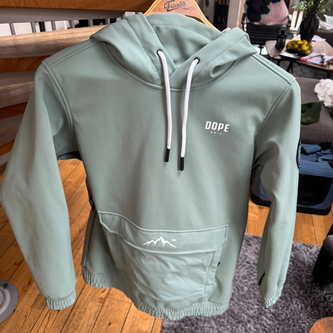 Snygg ljusgrön skid - och snowboard jacka från Dope med stor magficka, huva med snörning och patch på ärmen. Jackan har dragkedja i sidorna som kan knäppas upp om man blir varm, elastiska muddar.