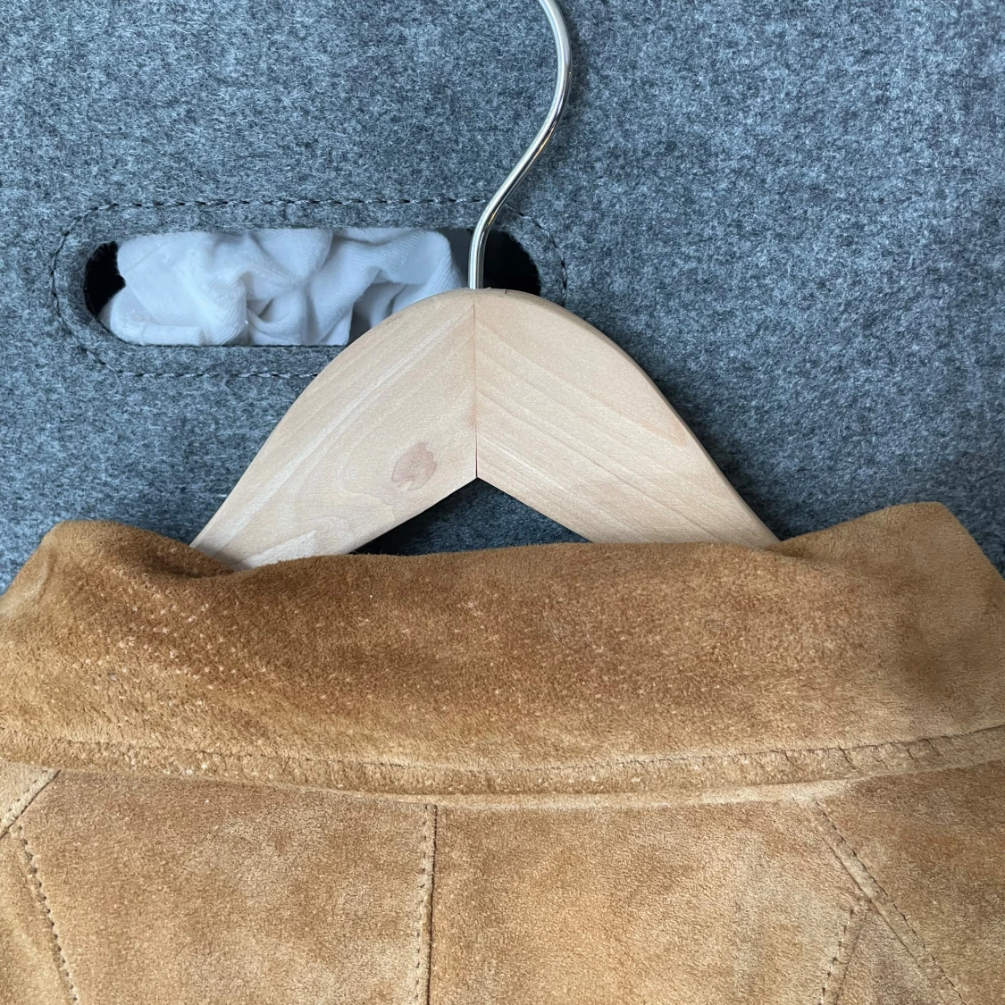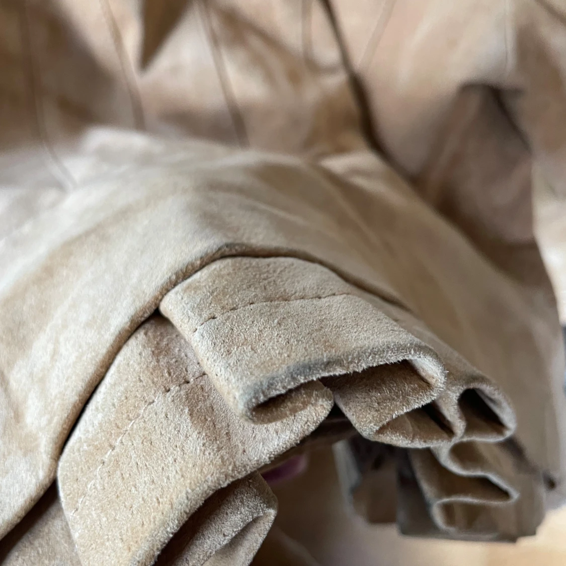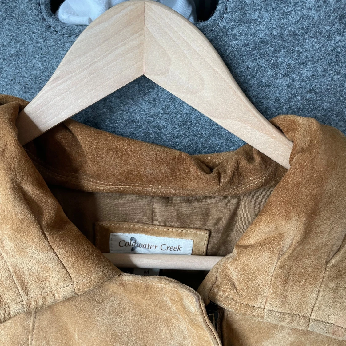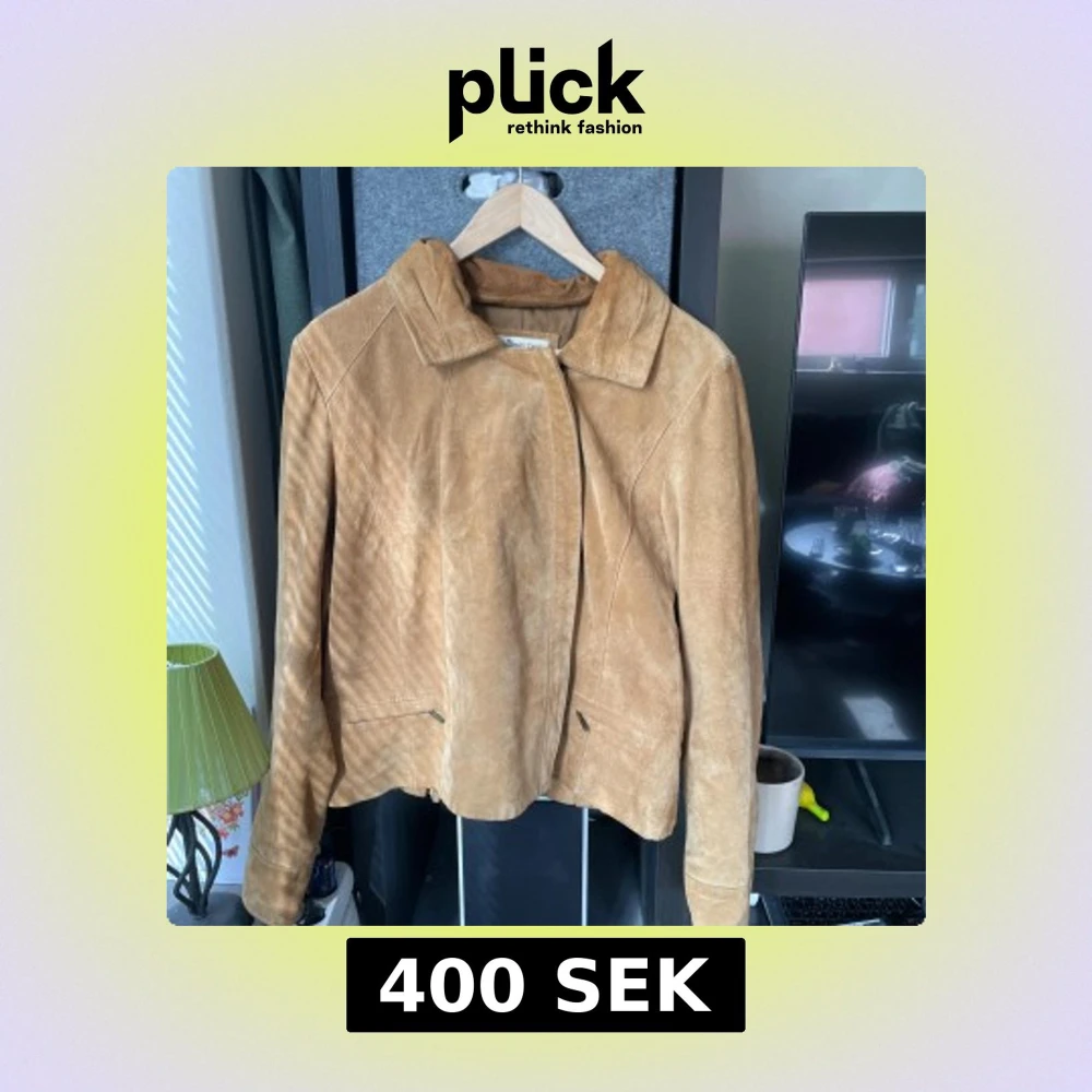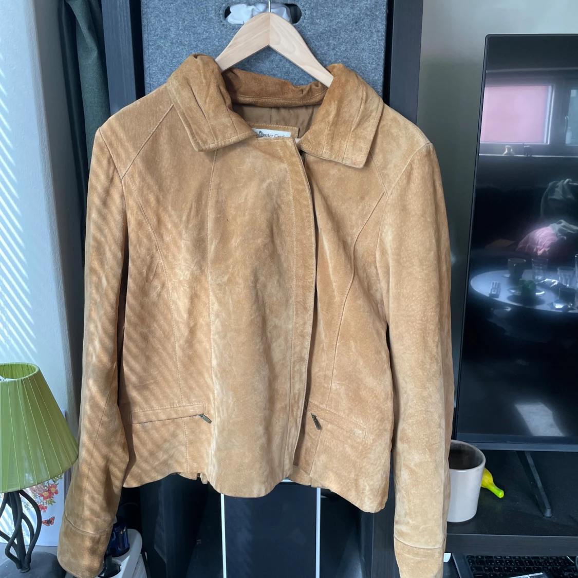 Snygg beige mockajacka från Coldwater Creek med klassisk krage och diskreta fickor med dragkedja. 100% mocka. Har några missfärgningar/smuts??