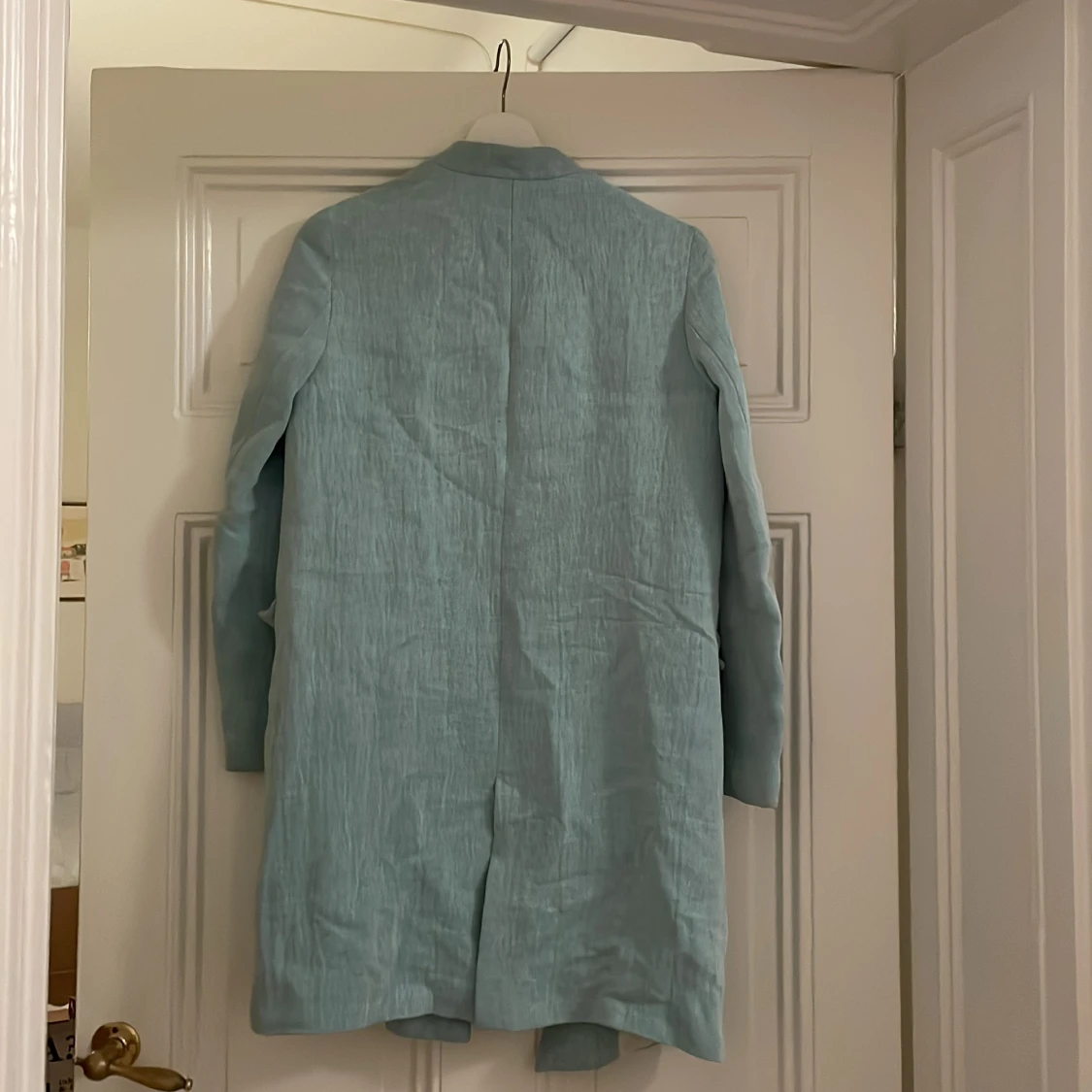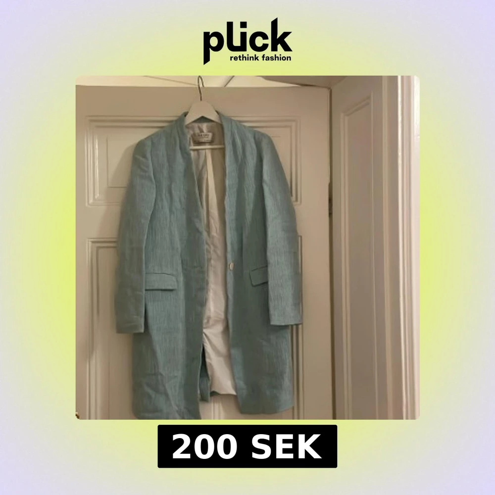 Elegant ljusblå kappa från Zara med en stilren design. Kappan har långa ärmar och en enkel knäppning framtill. Perfekt för vår och höst med sin lätta och bekväma passform. Tyget liknar linne.