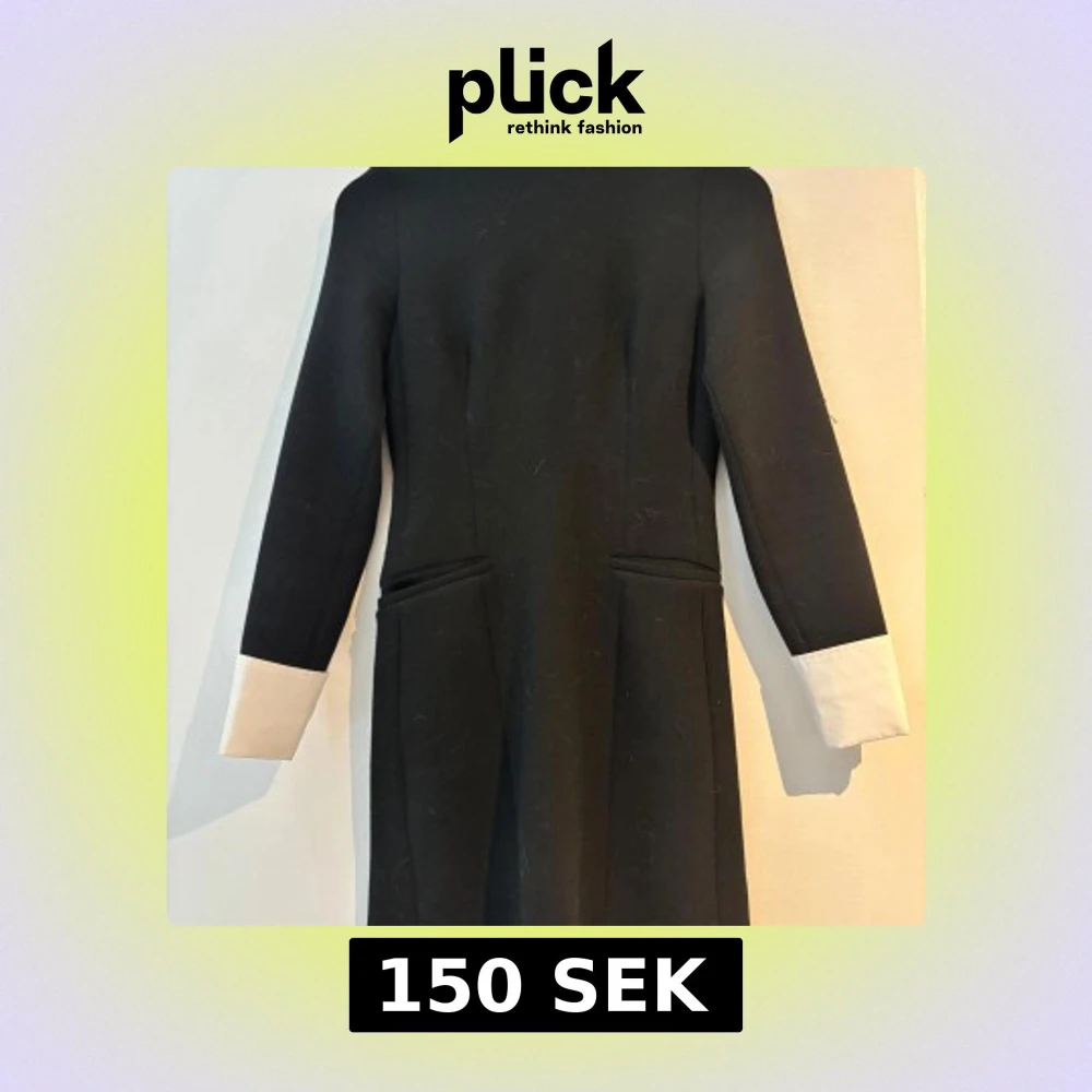 Elegant svart klänning med vita ärmslut. Den har en stilren design med långa ärmar och en klassisk passform. Perfekt för en chic look.