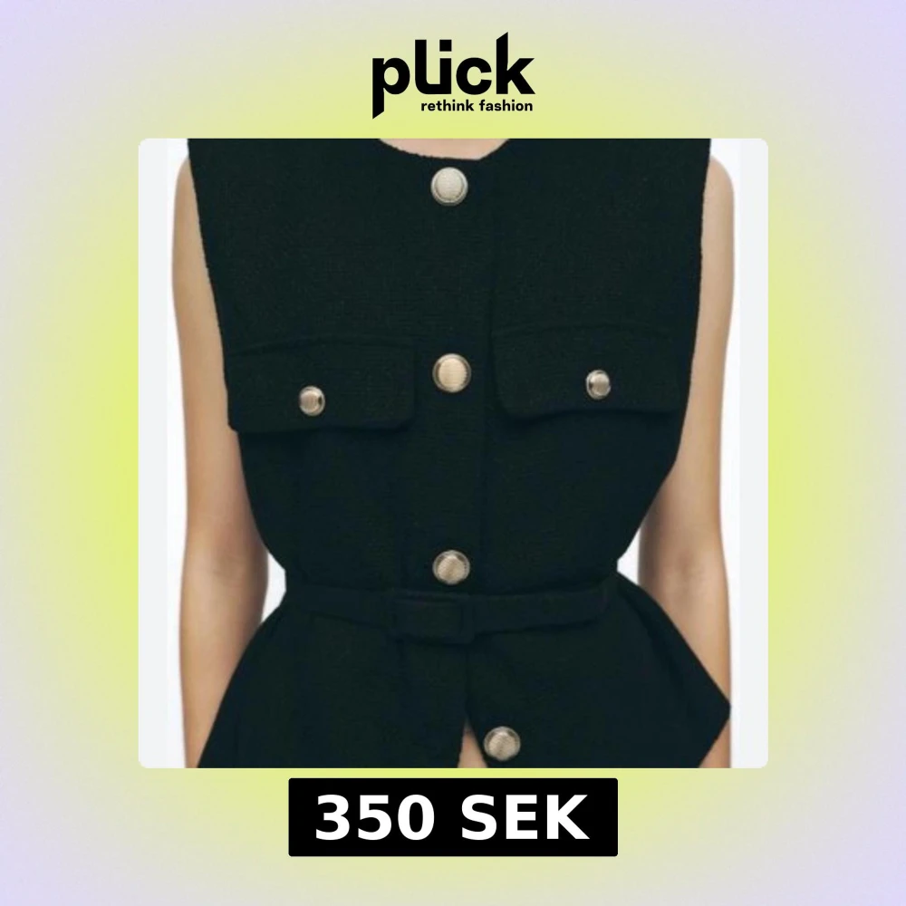 Stilren svart väst med markerad midja tack vare bälte och snygga guldiga knappar framtill. Västen har två fickor med lock på bröstet och är tillverkad i ett strukturerat tyg som ger en exklusiv känsla. Perfekt för att lyfta vilken outfit som helst.