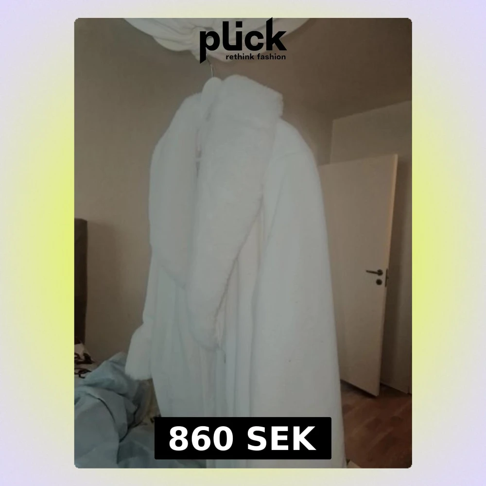 Säljer en vit pälsjacka med bred fluffig krage och muddar. Jackan har snygga knappar framtill och en elegant, lång siluett. Perfekt för dig som vill ha en clean och lyxig vibe i vinter. Jackan är riktigt mjuk och har en oversized känsla.