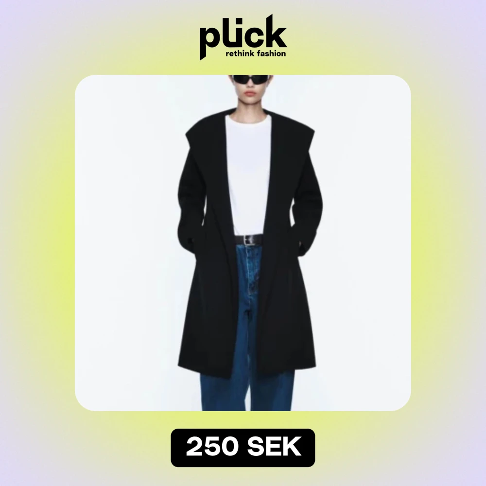 Zara kappa med luva. Hittade inte bild på hemsidan på exakt den, då den förmodligen inte finns kvar. Det är en vanlig svart kappa med luva och knappar. (Knapparna är det ända som skiljer sig från bilden). Den är i storlek S. Nypris: ca 700